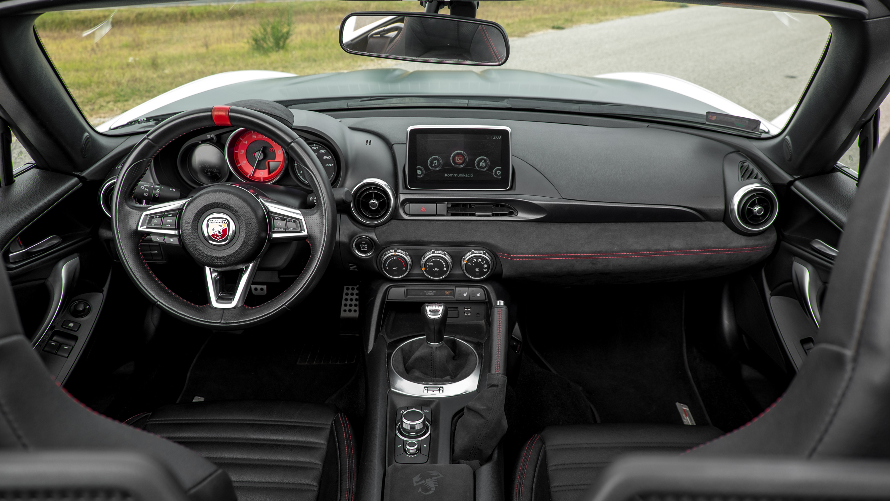 Elég csábító egy Abarth 124 utastere, a kormány szintén Mazda, de vörössel jelzik a közepét