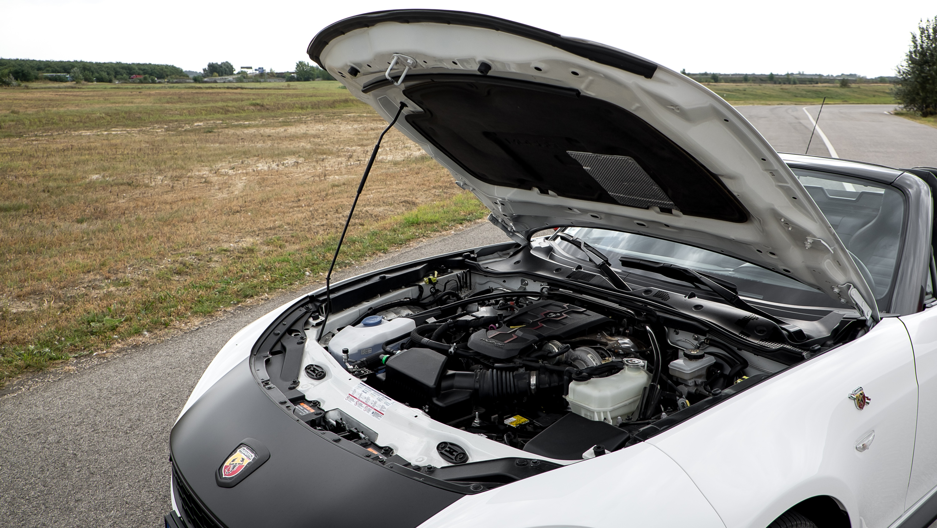 Váltója elvileg pont az előző NC szériás MX-5-ével azonos, mert a régebbi szerkezet bírja el az 1,4-es turbómotor nyomatékát. A 2500-as fordulatnál érkező 250 Nm nyomaték nem okoz földindulást, de tisztességesen meglódítja az apró karosszériát és belepréselt utasait. Az 5500-nál érkező 170 lóerős teljesítmény már az a szint, amit az MX-5-ben is kívántunk, a turbómotor karaktere miatt pont abban a tartományban teljesít jobban, ahol az MX-5-ből kicsit hiányzik a teljesítmény. A motorból sokat nem hallani, mindent elnyom a kipufogó hangja, ami zárt tetővel is masszívan hallható az utastérben is. Nem, ez nem elég jó kifejezés, magas fordulatnál lehetetlen benne beszélgetni, akárcsak autópályatempónál, ahol bőven 3500 fölött forog a motor hatodikban. A vászontető zajszigetelése nagyon gyér, túrázni inkább egy MX-5-tel mennék, hosszú távon nagyon fárasztó az Abarth. Rövidtávon viszont nincs jobb szórakozás, egy valamit sajnálok csupán, hogy csak hidegen csattog a kipufogó, bemelegedés után csak hangos, ezen hangolhatnának egy keveset.