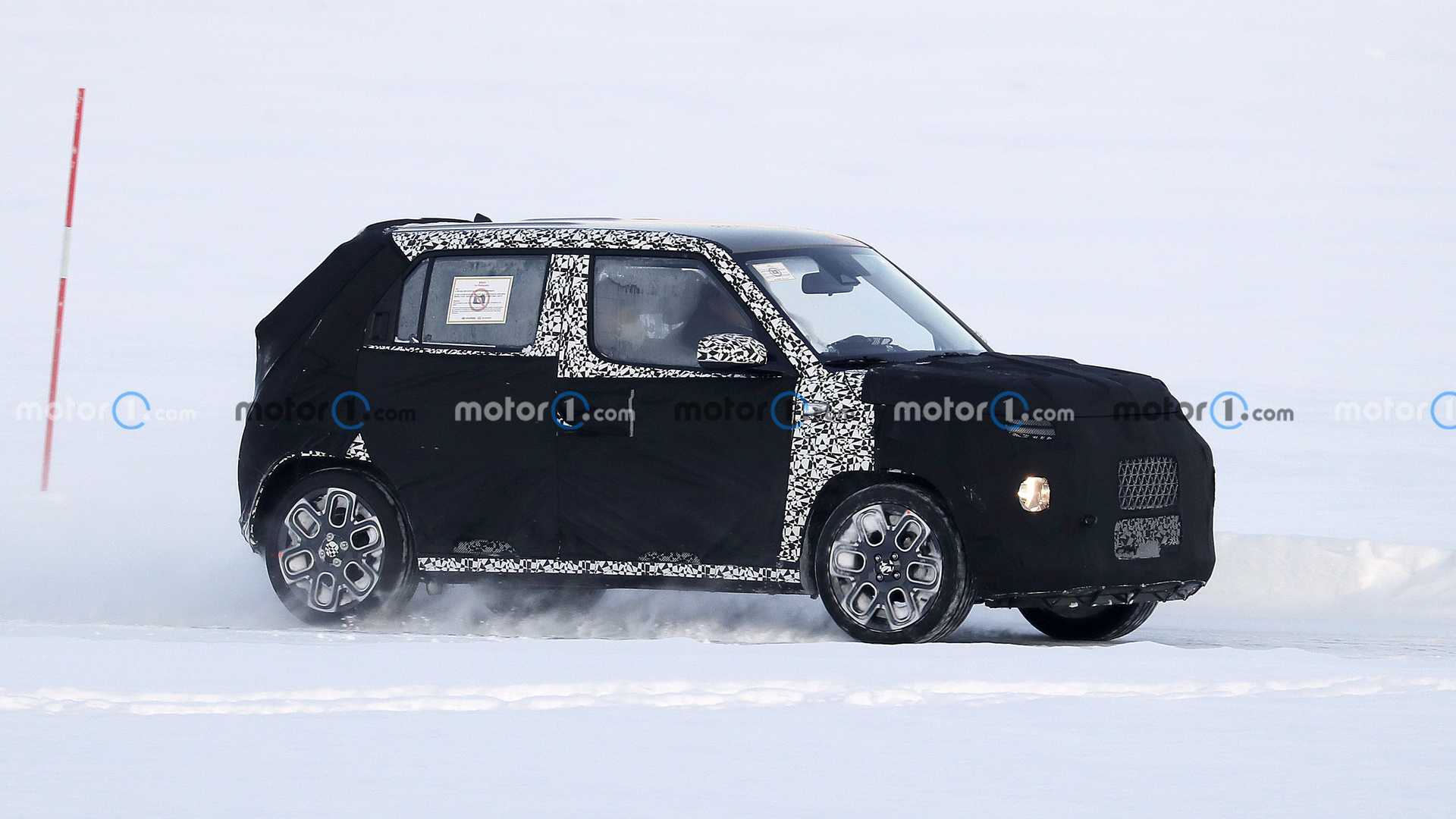 Kategóriákon átívelő a vonzalom minden iránt, ami kicsit is terepjáróra hajaz. A nagyobb és közepes SUV-k után egyre kisebb méretben is megjelentek a terepjárós stílusjegyekkel felruházott autók, így már négy méter alatt is léteznek crossoverek. Ebbe a kategóriába érkezik a Hyundai AX-1, aminek egyik prototípusa épp havas tesztköreit futja. Az apróság kerekeit a sarkokba tették, a tető viszonylag magasan fut, így az AX-1 kissé doboz jellegű, amit az eltérő méretű oldalablakokkal igyekeztek jópofává tenni. A hátsó szélvédő nem teljesen függőleges, hanem kicsit döntött, mindezekkel együtt az autó erősen emlékeztet az aktuális