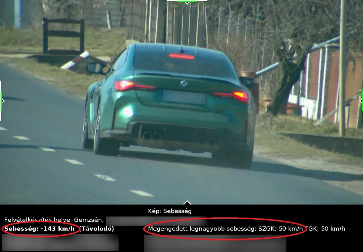A Gemzsén bemért, a típus specifikációi alapján legalább 480 lóerős BMW M4 a megengedett 50 helyett 143 km/órával száguldott át a településen. A fotó ráadásul már az intenzív fékezés megkezdése után készült, így vélhetően ennél jóval több volt a valós sebességtúllépés, mielőtt a sofőr észrevette a traffipaxot. Ha csak a lefotózott tempóval számolunk, a féktávolság akkor is nagyjából 100 méterrel nő a szabályos sebességhez képest. Hogy értsd: ha kilépne eléd valaki, és 50-ről még meg éppen tudnál állni, akkor 143 km/óráról annyi időd sem lesz, hogy reagálj: kormánymozdulat, fékezés, bármilyen korrekció nélkül fogod elcsapni, és nem lesz kérdés, hogy ki volt a hibás.