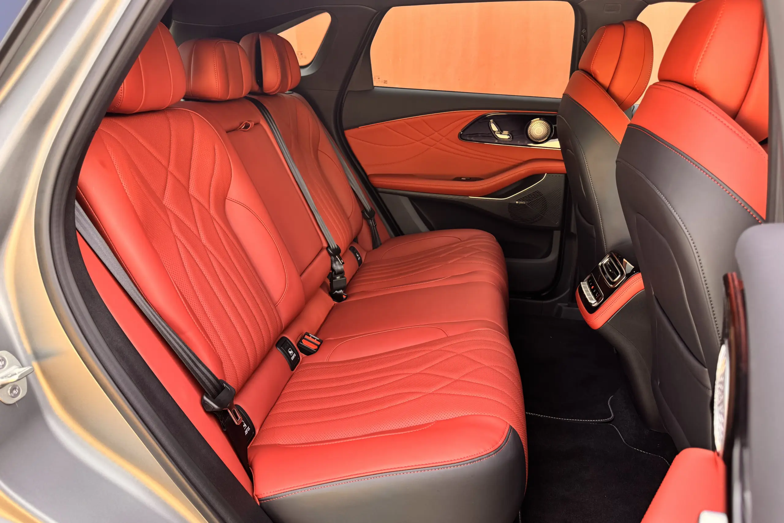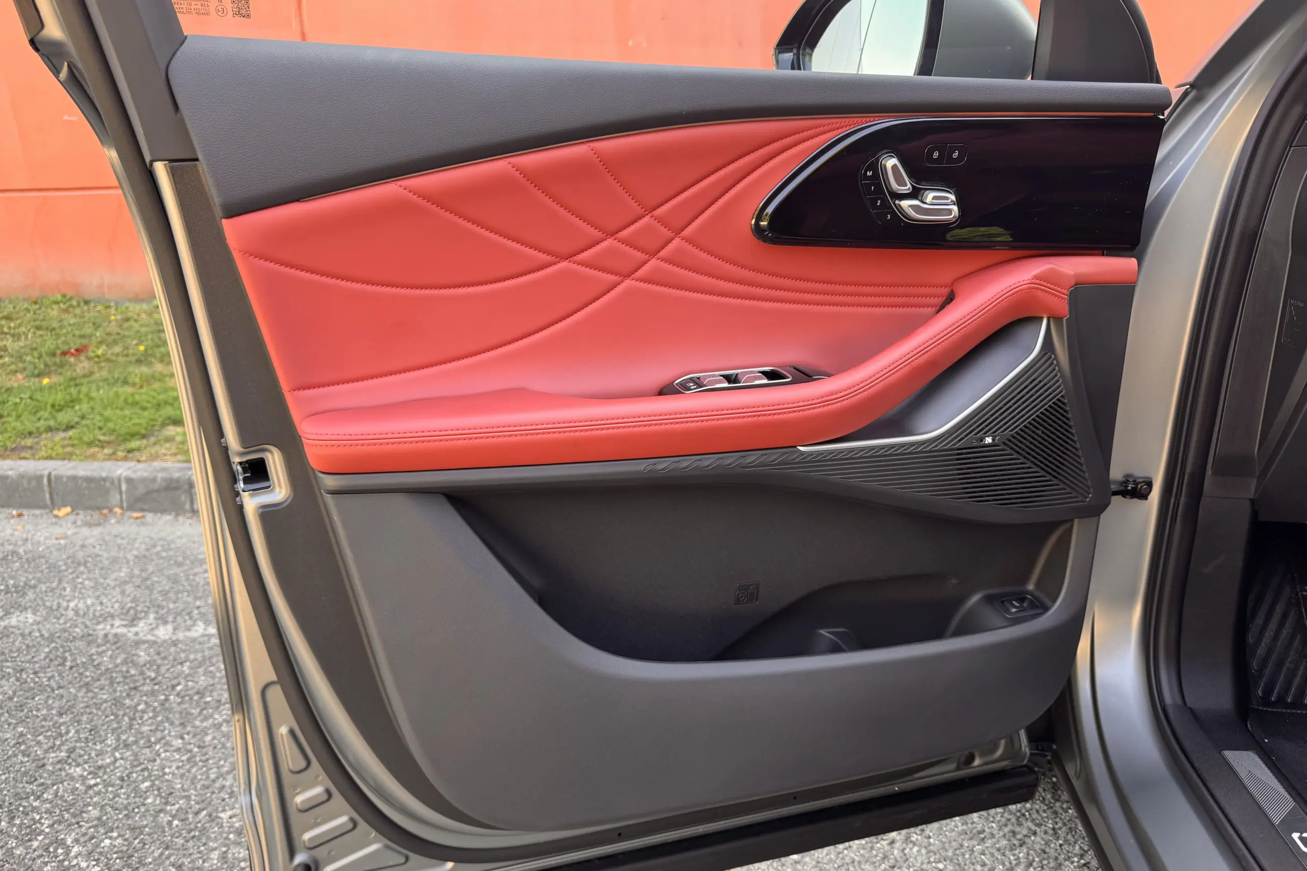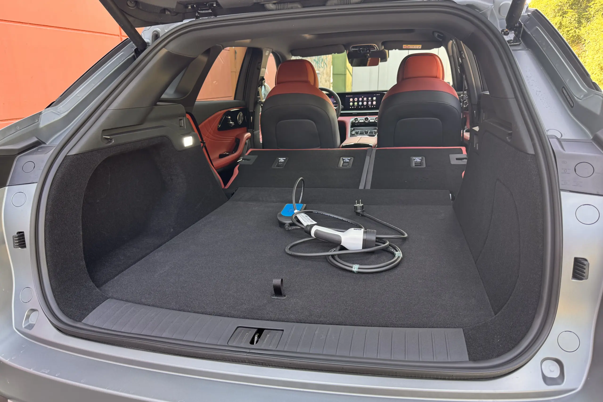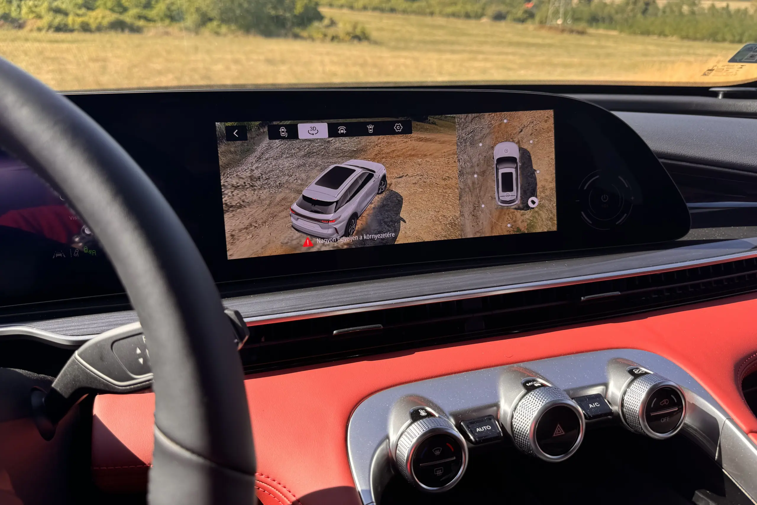 Az első ülések körbeölelnek, kiválóan tartanak, fűtenek, hűtenek és ha szeretnéd masszíroznak. A fűtés/hűtésből pedig hátra is jut, ahol óriási a lábtér, hosszabb távon is öröm itt utazni, azt pedig a hajtásláncnál majd elárulom, mennyit lehet egyetlen feltöltéssel/tankolással. De még elöl időzve kicsit, érdemes megemlíteni a vezeték nélküli (hűtött) telefontöltőt, a fizikai tekerőgombok meglétét, amikkel a klímát lehet vezérelni, illetve üzemmódot választani. Továbbá az infotainment szép grafikáját, lényegében könnyű kezelhetőségét, bár itt azért kell egy kis idő, amíg hozzászoksz a