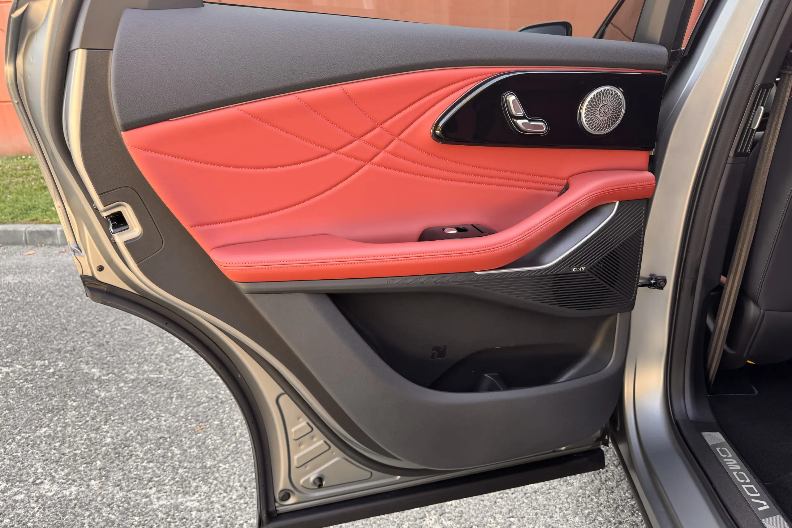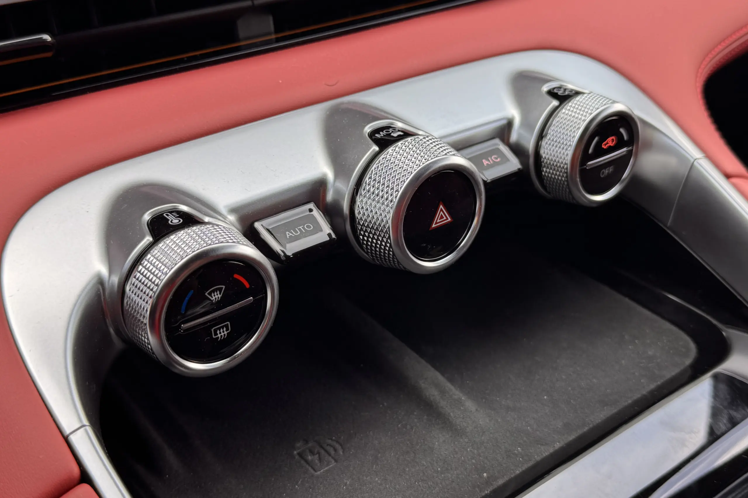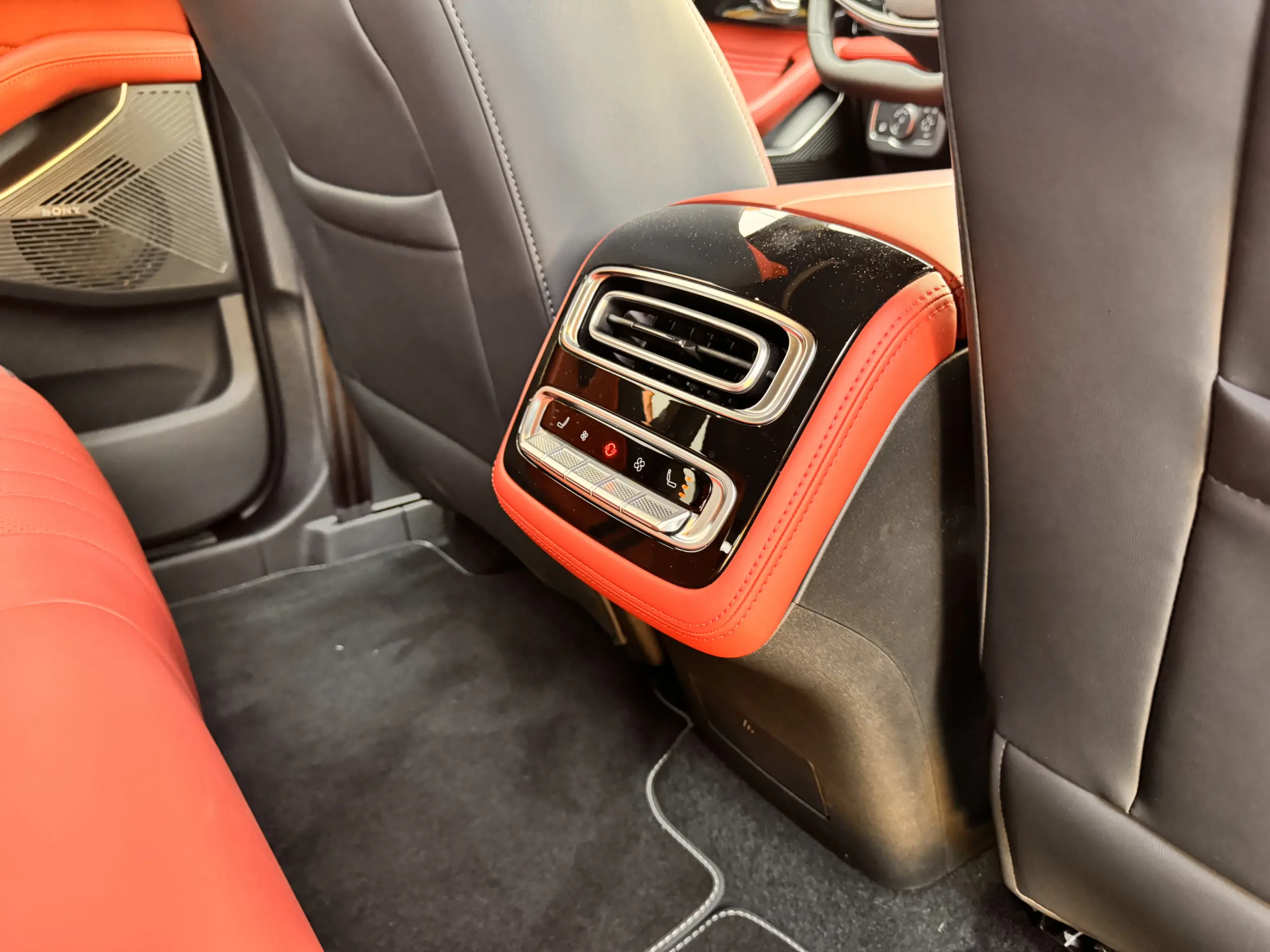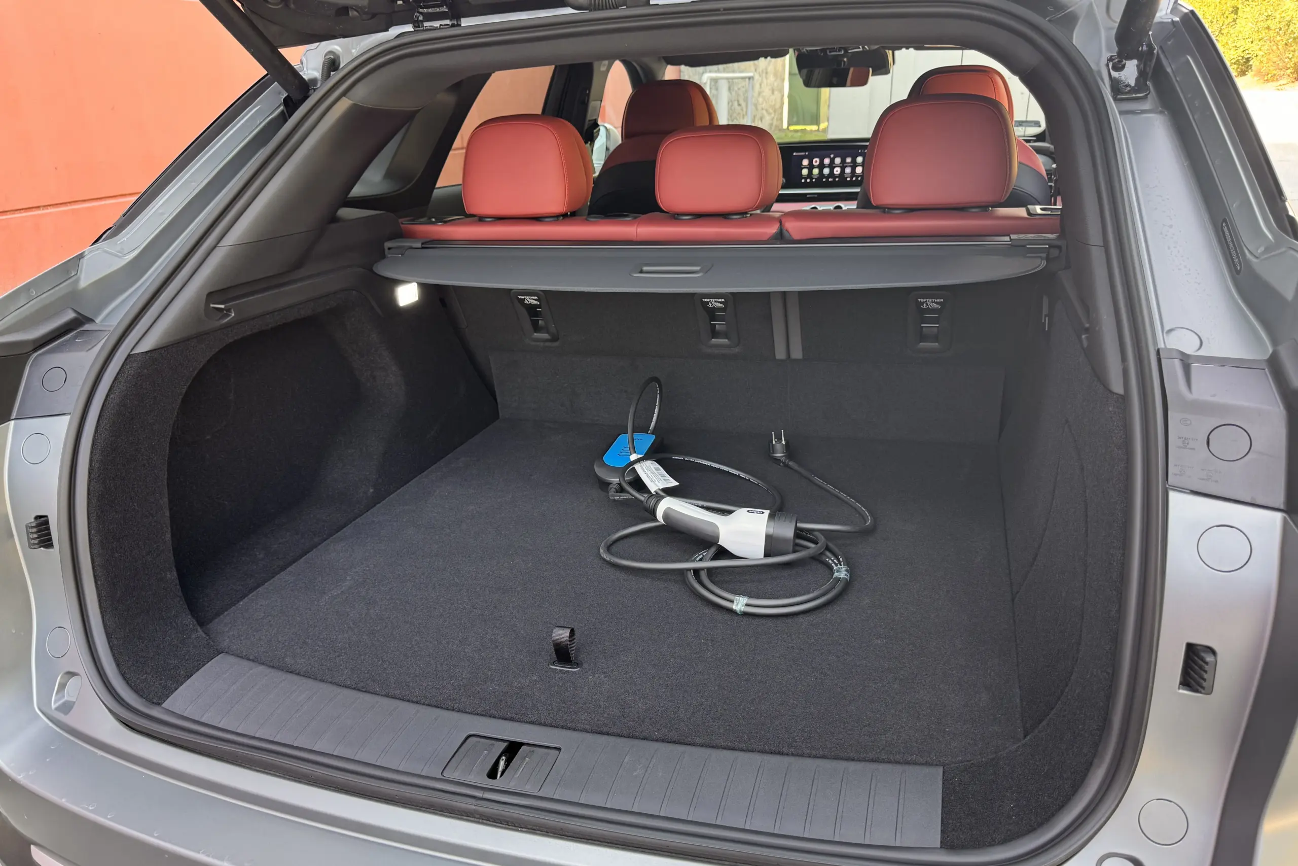 Az első ülések körbeölelnek, kiválóan tartanak, fűtenek, hűtenek és ha szeretnéd masszíroznak. A fűtés/hűtésből pedig hátra is jut, ahol óriási a lábtér, hosszabb távon is öröm itt utazni, azt pedig a hajtásláncnál majd elárulom, mennyit lehet egyetlen feltöltéssel/tankolással. De még elöl időzve kicsit, érdemes megemlíteni a vezeték nélküli (hűtött) telefontöltőt, a fizikai tekerőgombok meglétét, amikkel a klímát lehet vezérelni, illetve üzemmódot választani. Továbbá az infotainment szép grafikáját, lényegében könnyű kezelhetőségét, bár itt azért kell egy kis idő, amíg hozzászoksz a