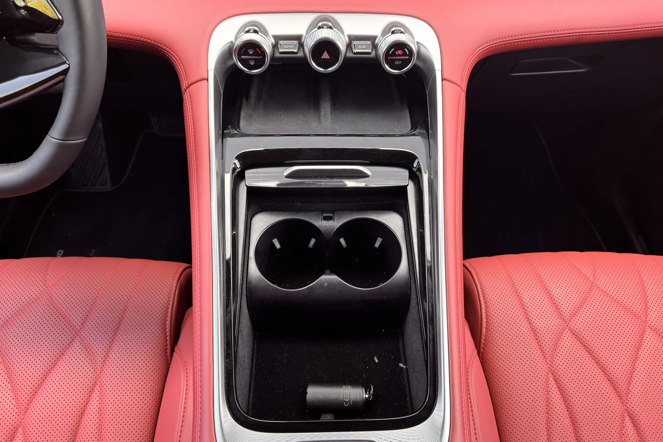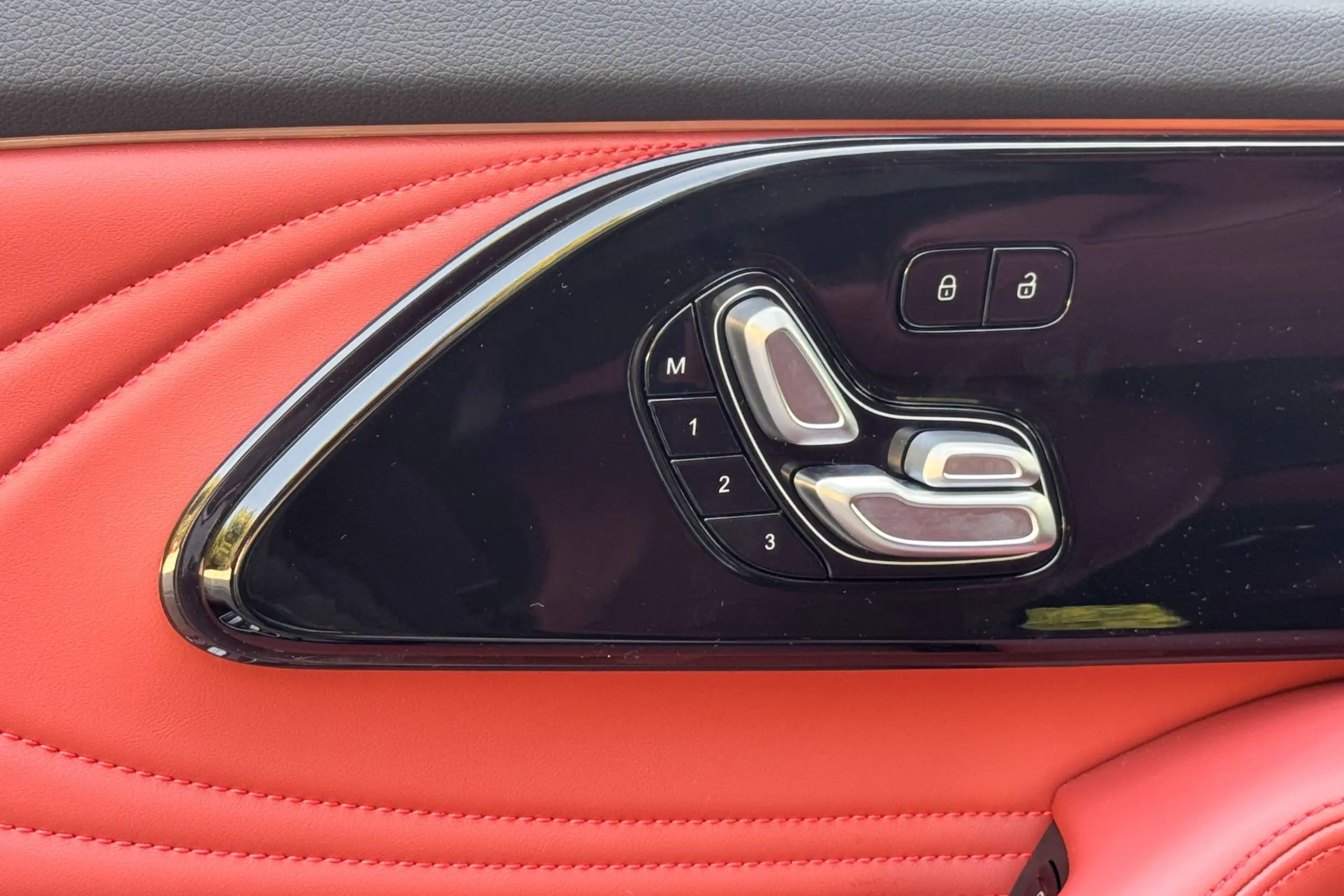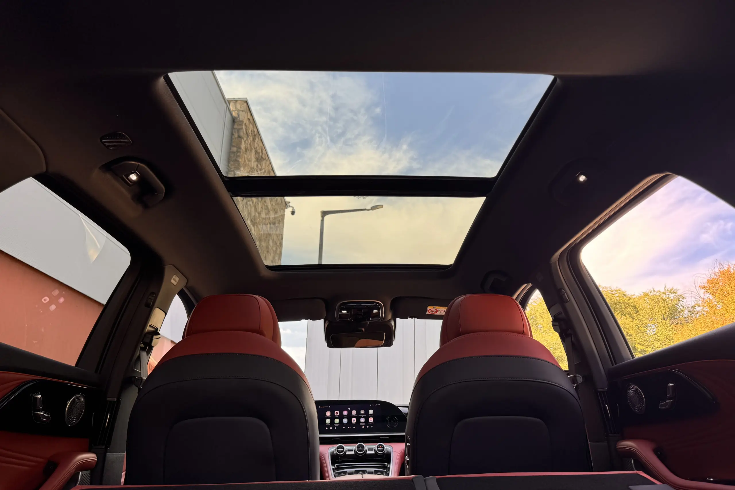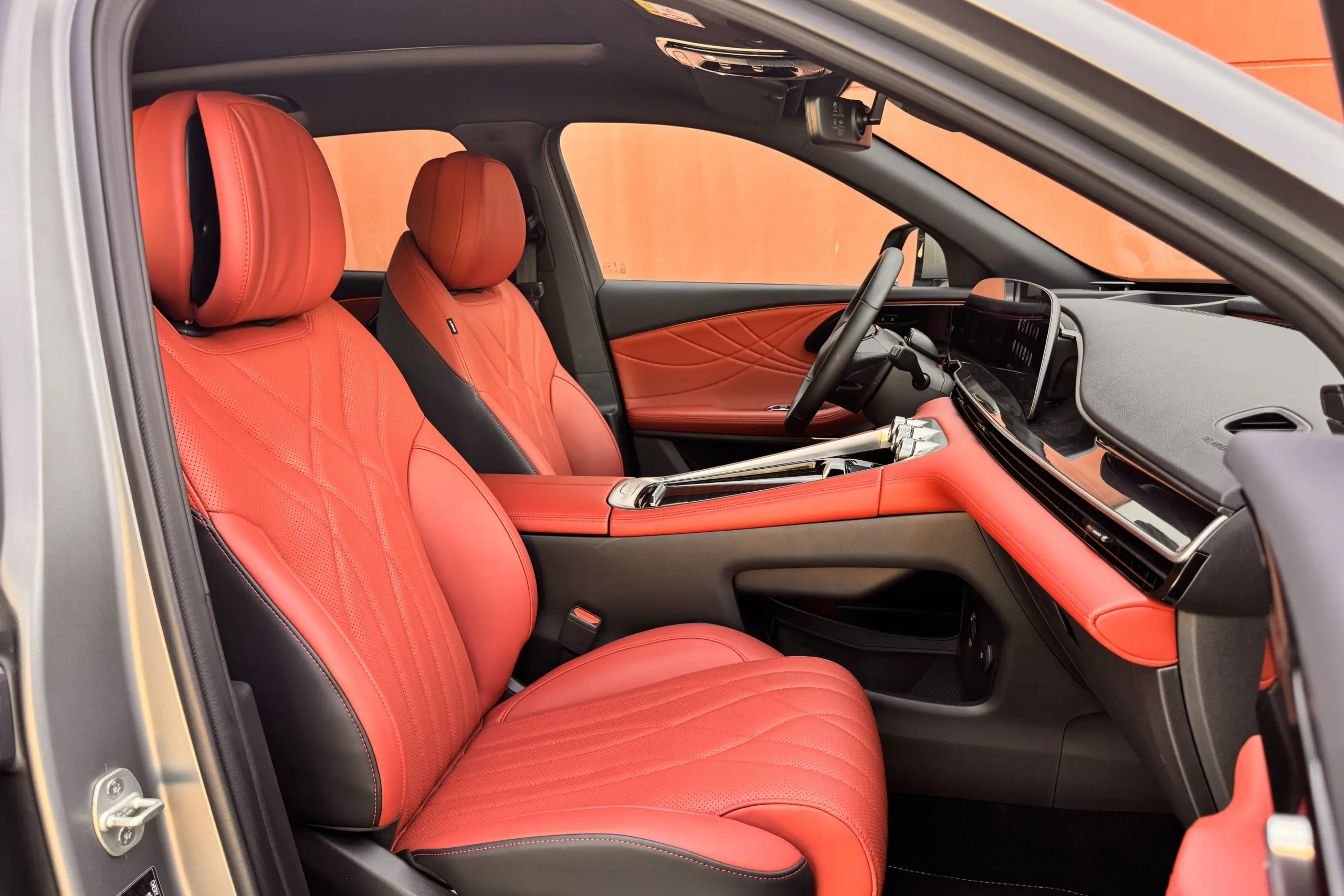 Az első ülések körbeölelnek, kiválóan tartanak, fűtenek, hűtenek és ha szeretnéd masszíroznak. A fűtés/hűtésből pedig hátra is jut, ahol óriási a lábtér, hosszabb távon is öröm itt utazni, azt pedig a hajtásláncnál majd elárulom, mennyit lehet egyetlen feltöltéssel/tankolással. De még elöl időzve kicsit, érdemes megemlíteni a vezeték nélküli (hűtött) telefontöltőt, a fizikai tekerőgombok meglétét, amikkel a klímát lehet vezérelni, illetve üzemmódot választani. Továbbá az infotainment szép grafikáját, lényegében könnyű kezelhetőségét, bár itt azért kell egy kis idő, amíg hozzászoksz a