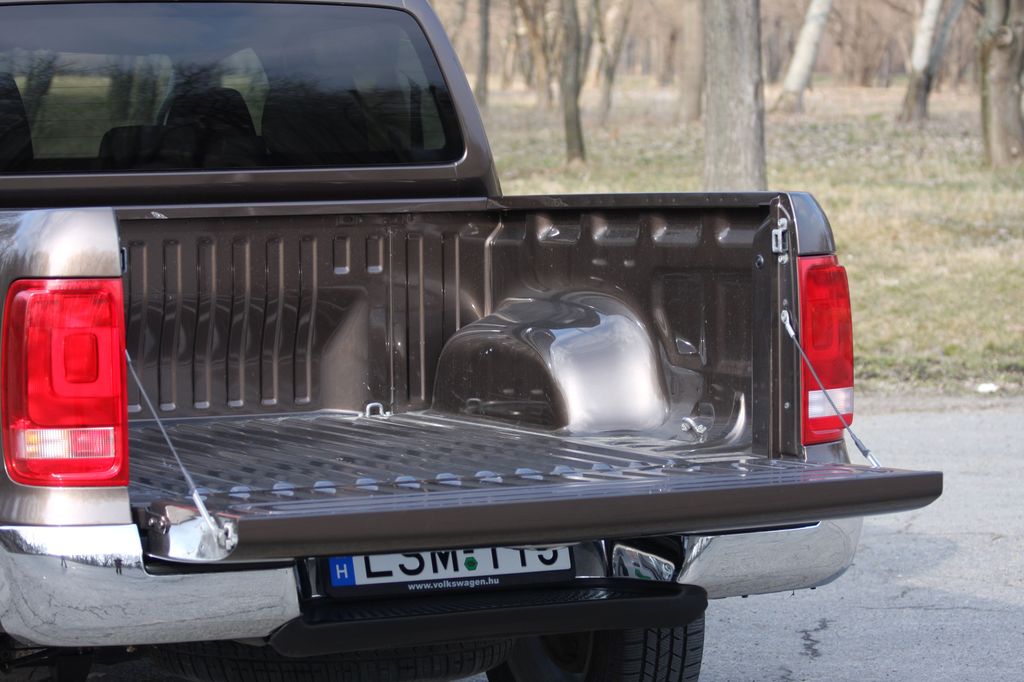 Nissan Navarával említhető egy lapon. Mivel egy pickup gazdagon extrázva inkább divatjármű, mintsem lestrapálásra ítéltetett munkaeszköz, a Volkswagen is bőven kínál lehetőséget a cicomázásra, hiszen a kiegészítőkön szép summát lehet keresni. Szerencsére a tesztautónál nem estek szélsőséges túlzásokba, a 18 colos felniken és néhány krómozott elemen kívül voltaképpen azt kaptuk, amit az alapáron bruttó 8,96 millió forintba kerülő Highline nyújt a gazdájának. A különféle rendelhető díszítések leltárba vételénél azonban sokkal fontosabb tudnivaló, hogy a raktér belső szélessége a kerékjáratok között mérve is 1222 mm, azaz ha cipőkanállal is, de itt keresztben elfér a szabványos EUR-raklap, amelynek hossza és szélessége 1200x800 mm. A jó fogású kilinccsel ellátott hátsó ajtó nem zárható, ellenben 12 voltos csatlakozó, valamint utastérből kapcsolható platóvilágítás könnyíti az életet – utóbbi a harmadik féklámpával került közös egységbe, közvetlenül a fülke hátsó szélvédője fölött. A tesztautónál nem erőltették a belső platóburkolatot, de felárért van lehetőség a sérülékeny festett fémfelület teljes körű védelmére.