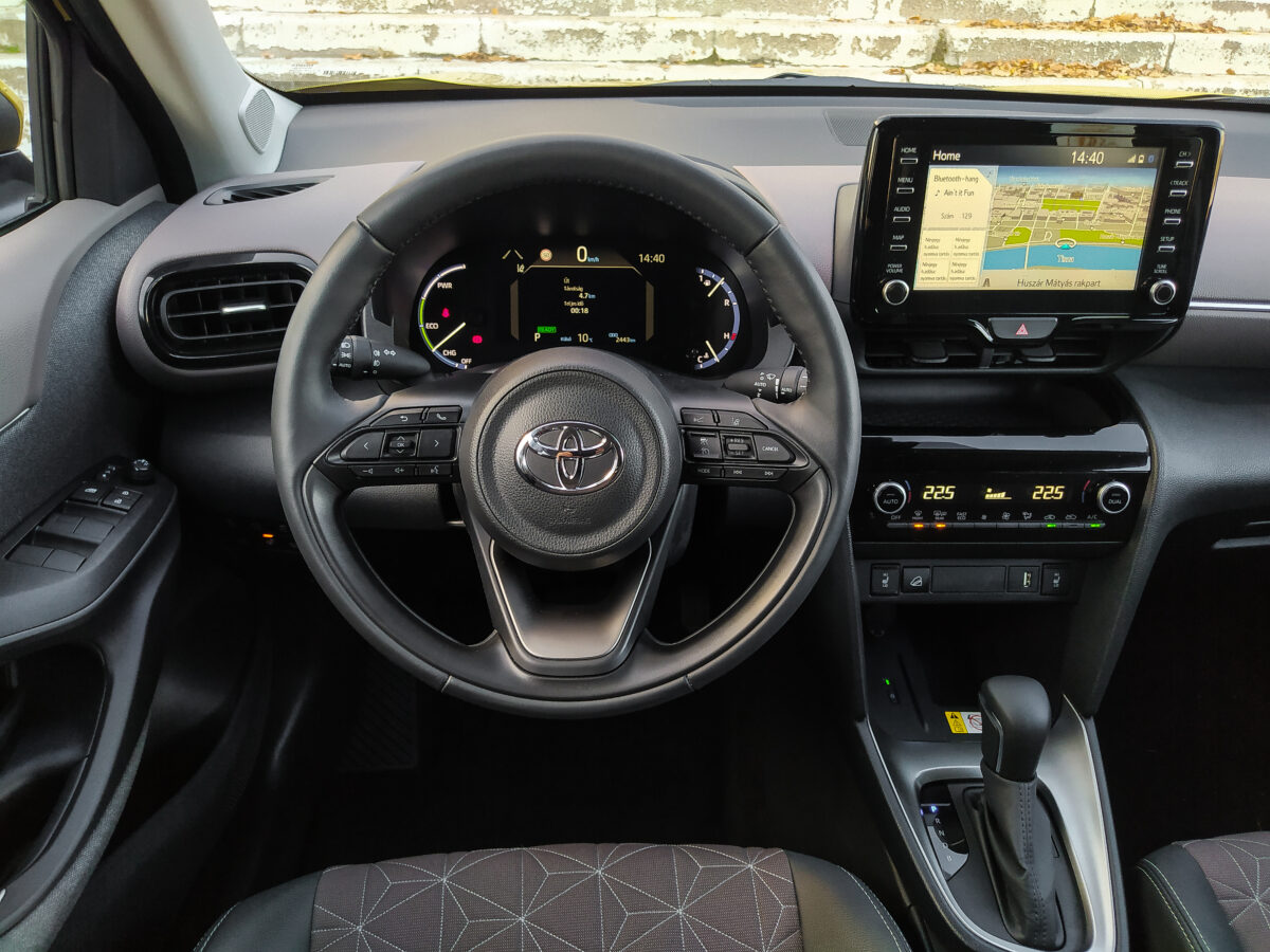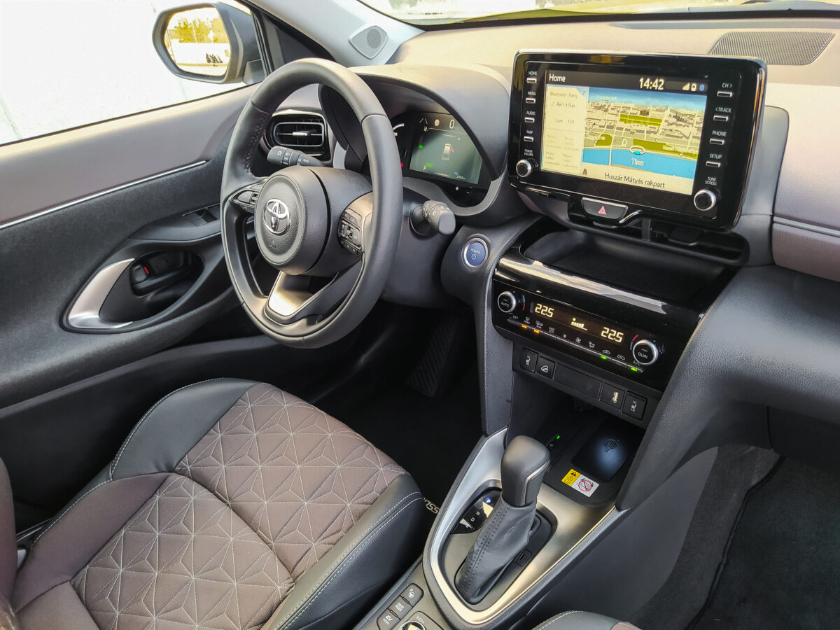 A Yaris Cross tipikusan az az autó, amit nem éri meg centivel méregetni, legalábbis kívülről. A számok szerint ugyanis igen nagynak tűnik, papíron a méretei már-már megtévesztőek. Épp amennyivel hosszabb egy Vitaránál, annyival keskenyebb, de ez valahogy sem kint, sem pedig bent nem látszik, és nem is érződik. Túlzásba esni sem érdemes mondjuk az összeméréssel, hiszen a magyarok kedvence sem egy hatalmas autó, de szögletességének hála már-már nagyautós térérzetet tud produkálni az első sorban, míg a Yaris Cross esetében felfelé haladva érezhetően szűkül a bódé, a Toyota crossovere inkább kisautósan szeretne menő lenni.