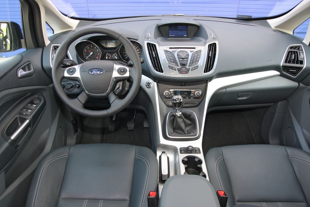 Nem csak a far, a két oldalfal is meredek, így igen nagy a belső tér. A C-Max csendesen, és még opciós, alacsony oldalfalú, 215/50 R17-es abroncsaival is egészen kényelmesen fut. Nem csak motorja, fékrendszere is combos