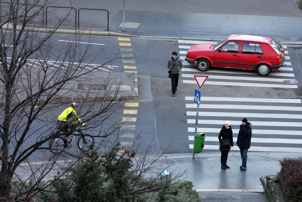 A szürke szabadidő-autó sofőrjének látnia kellett a gyalogosokat, ő azonban úgy gondolta, inkább átmegy előttük - minek fékezzen? Megint gyorsítani kéne... Néhány perc alatt sok ilyet láttunk, nagyjából az autósok fele tett eleget elsőbbségadási kötelezettségének