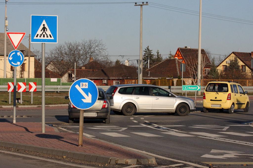 - Azon az úton, amelynek menetirány szerinti jobb oldalán két vagy több forgalmi sáv van útburkolati jelekkel kijelölve, a körforgalmú útra történő bekanyarodást a besorolás rendjét jelző tábla és az útburkolati jelek jelzéseinek megfelelően kell végrehajtani. Magyarul: ha többsávos úton többsávos körforgalomhoz érsz, s tudod, hogy például az első lukon kéne távoznod, a külső sávból menj be. Ha nem az elsőn, akkor a belsőből. Igen, itt kezdődnek a gondok, ezzel lejjebb még foglalkozunk.