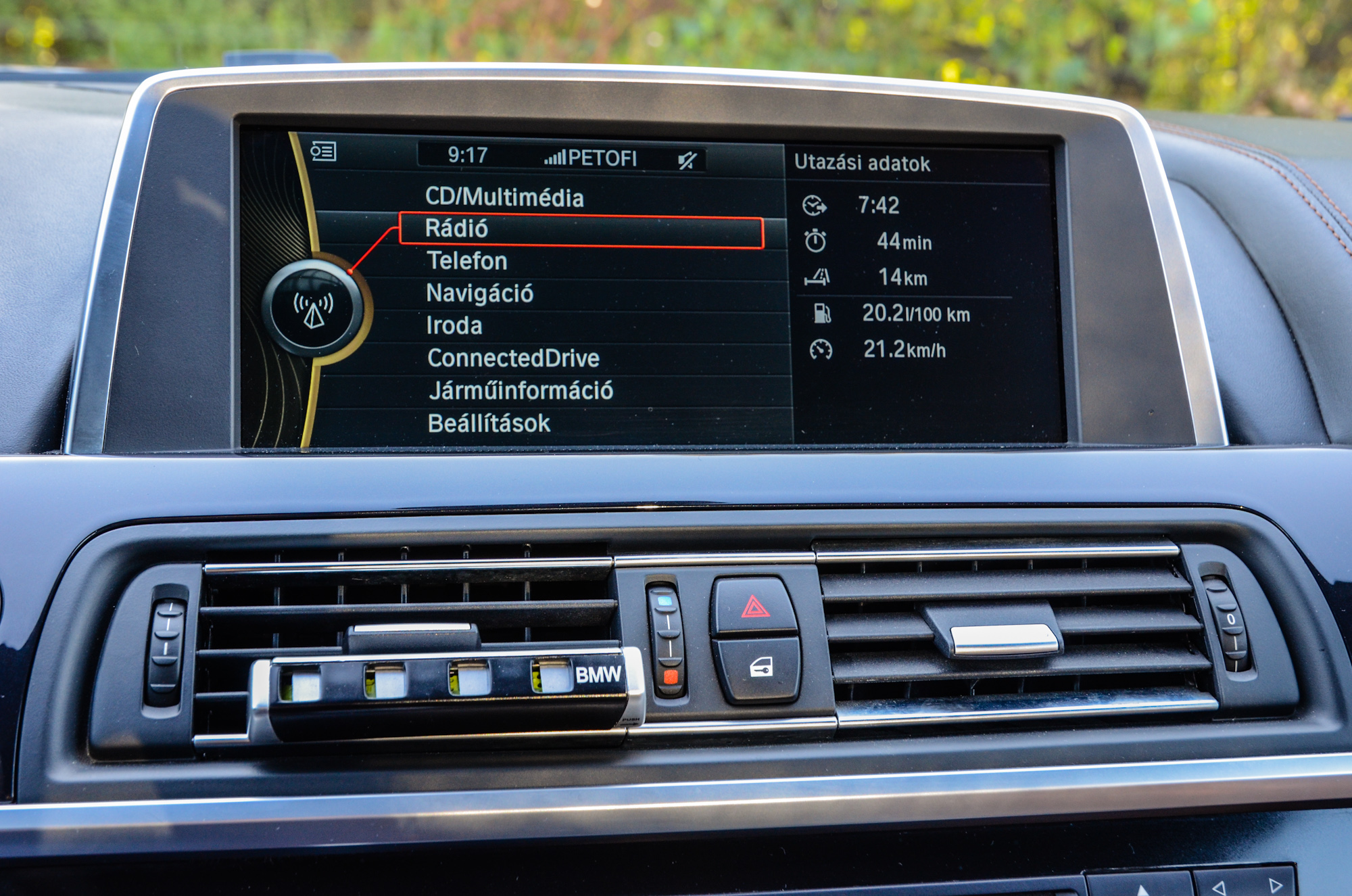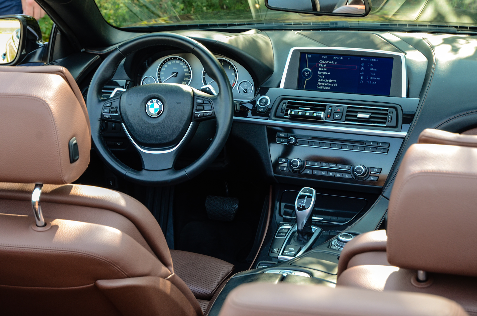A jelenlegi tulajdonosnak mindössze két fő kikötése volt vásárlás előtt. Ne fekete legyen a belső és ülésszellőztetés legyen benne. Ehhez képest jócskán többet kapott. Az újkori ár egyértelműen arról árulkodik, hogy gazdagon felextrázták a 6-ost, a Premium Selection BMW-kre egyébként is ez jellemző. Mivel a bajorok extralistája olyan hosszú, hogy felesleges lenne mindent felsorolni, inkább azt írom le, hogy mi nincs benne. Night Vision, nagy hifi, prémium bőrkárpit, 360 fokos, felülnézeti kamerarendszer és kerámia díszítőelem (a váltógombra és az iDrive-ra).