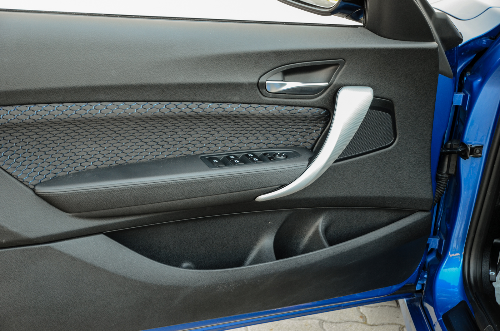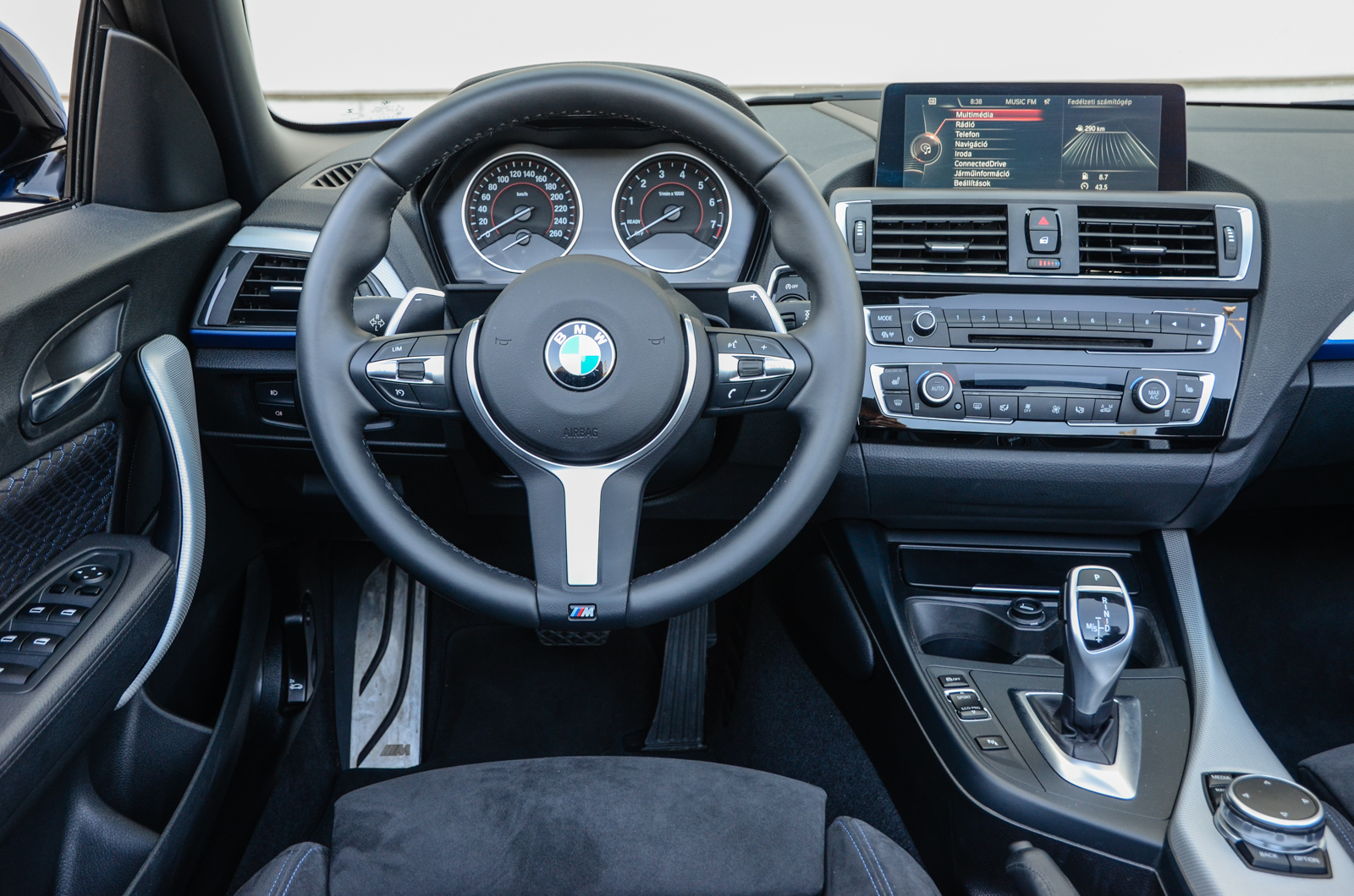 Ritka jó beltér. Nem csak a külső, a belső is ízléses ezzel a M csomaggal. Az idei évben számos BMW tesztautó után ez volt az első olyan, amelyikben nem bőrülés volt, és ezek után azt mondom, hogy nem is kell a bőrkárpit. Az tény, hogy egy 5-ös vagy 7-es manapság már bénán nézne ki bőr nélkül, de az 5-östől lefelé nem kell szégyellni a szövet ülést, pláne ha az kényelmesebb is. Márpedig ebben a 2-esben nagyon el volt találva minden. Alapvetően a BMW-k híresek arról, hogy jól személyre szabhatók és az üléspozíció mellett a komfort is a helyén van, a 2-esben ezt minden eddiginél jobban eltalálták.