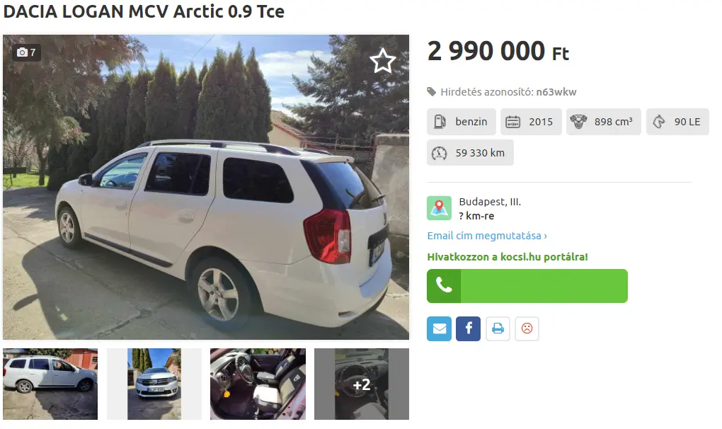 Az első kategória ismét a kombi, ahol máris problémába ütköztem. Több nagyobb oldalon is kerestem az ajánlatokat, ám a rengeteg tévesen megadott futásteljesítmény után sorra olyan találatok következtek, amelyeknél még képet sem töltött fel a hirdető a 30-40 ezer kilométert futott autóról. 60 ezer kilométerig bővítve a keresést már akadtak képek a járművekről, ám a legtöbb esetben sem rendszámot, sem pedig alvázszámot nem tettek közzé, így ellenőrizhetetlenek voltak az állítások, egészen a fenti képen látható Dacia Logan MCV példányig. Az 59 330 kilométeres futásteljesítmény nem minimális, ám egy 10 éves autótól még így is kimondottan kevés, éves szinten kevesebb, mint hatezer kilométer. Még a nagyra pumpált karosszéria és a 0,9 literes turbómotor kombinációja sem túl ijesztő ezzel az óraállással, ráadásul manipulációnak sem láttam jelét, így nyugodt szível hirdetek kategóriagyőztest.