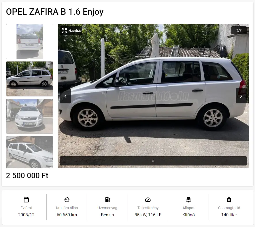 Sokkal egyszerűbbnek tűnt a helyzet a hétülésesek mezőnyében, ahol egy 2008-ban gyártott Zafira azonnal elvitte az aranyérmet: 17 évnyi szolgálat során alig lépte át a 60 ezer kilométert, így kívül-belül újszerű állapotnak örvendett. Aztán feltűnt, hogy hol a csapda a 2,5 millióért kínált családi autó esetében: a gyári alapfelszereltségnek nem része a klíma, ebbe a konkrét példányba pedig extraként sem fizették ki. Ennek fényében, főleg a hétüléses családi autók mezőnyében jogosnak tartom, ha egy valós vásárló tovább keresne.