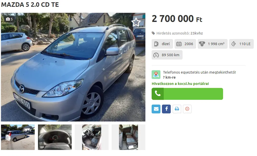 Ettől még az aranyérem jár a Zafirának, de szerintem érdemes megemlíteni a legkevesebbet futott, klímás opciót is, ami a cikk szerkesztésekor egy Mazda 5 volt, méghozzá a 2,0 literes benzinmotorral. Itt azonban az óraállás már közel 90 ezer kilométer, a gyártási év is 2006, illetve az ár is magasabb, 2,7 millió forint. Mindezt egy olyan típusért, ami korrózióra hajlamos, így még akkor is szakértői átvizsgálást igényel, ha a képeken, illetve laikus szemmel nem látványos a rozsdásodás.