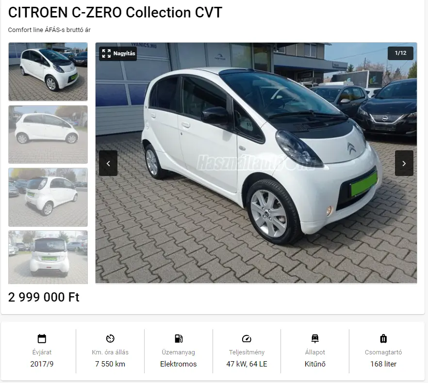 A villanyautók esetében sajnos nem volt más választásom a találatok összegyűjtésekor, minthogy megszegjem a saját szabályaimat. Mivel 20 ezer kilométer alatt rengeteg a találat, ám még 10 ezer kilométer alatt is akadnak eladó villanyautók a kijelölt kereten belül, ezért az eredmények eltorzítása lenne egy közel 40 ezer kilométeres példányt választani. Még akkor is, hogyha ez az első, amelynek valóban igazolható a futásteljesítménye kizárólag a hirdetésben megadott adatok segítségével. Hozzá kell továbbá tenni, hogy ezeket a járműveket rengetegen használják második-harmadik autónak, vagy kizárólag kisebb távokra, településen belül. Éppen ezért nem tartom kizártnak a 7550 kilométeres futásteljesítményt sem, főleg a fent látható, 2017-ben gyártott C-Zero hirdetés szerinti állapotának fényében. Ha mindenképp ragaszkodnék a korábbi kikötésemhez, hogy le tudjam kérdezni az autót, akkor is ugyanezt a műszakiságot láthatnátok a képen, csak épp Peugeot logóval, 2014-es évjárattal, 38 ezer kilométerrel és 2,3 milliós árcédulával.