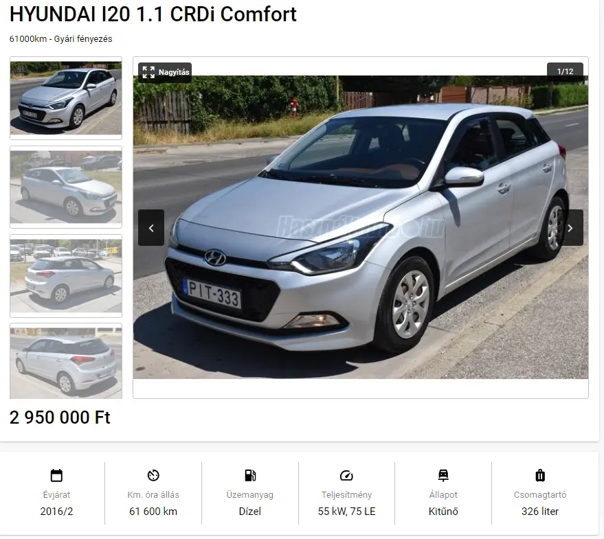 A dízelek mezőnye a legérdekesebb merítés ebben a keresésben. Erre viszont számítottam is, hiszen viszonylag kevesen vásárolnak új dízelt azért, hogy aztán keveset menjenek vele. A különböző világok érdekes metszeteiből áll tehát a kínálat: hirdetnek 3 millió alatt például kabrió H Astrát 85 ezer kilométerrel 2007-ből, de akadnak kisebb-nagyobb francia technikával szerelt járművek is ennyiért, HDi és dCi erőforrással is akad 65 ezer kilométer alatti futásteljesítménnyel autó. Az abszolút bajnok viszont egy Hyundai i20, méghozzá 2016-ból, az 1,1 literes turbódízel motorral, amelynek az órája mindösszesen 61 ezer kilométert mutat. 2,95 milliós árcédulájával szinte a teljes keretet kimeríti, ám a győzelem itt is egyértelmű.