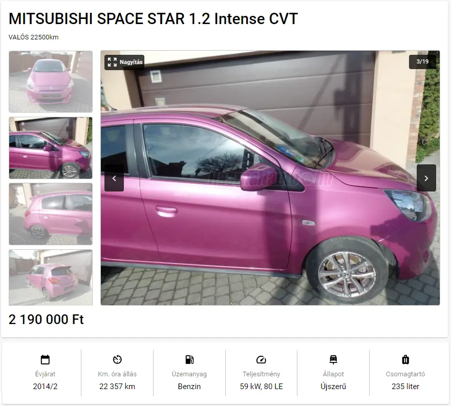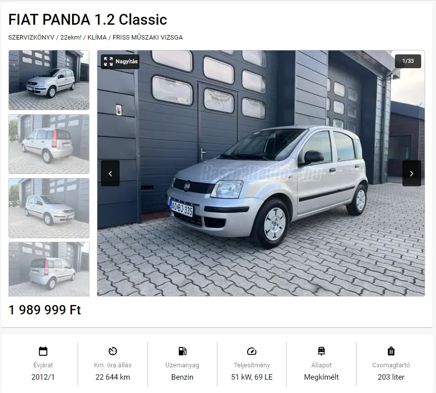 A bajnok leleplezése előtt érdemes egy fontos megjegyzést beszúrni. Hogyha a valóban legkevesebbet futott, lekövethető előéletű autókra hajtanál 3 millió forintból, akkor bizony 10-15 évesen, 10 és 30 ezer kilométer közötti futásteljesítménnyel gyakorlatilag az összes olcsó, fapados típusból választhatsz jelenleg Magyarországon. Korabeli Daciák, négyszemélyes Suzukik, Fiat Pandák, Renault Cliók, és még sorolhatnám. Bármelyikből beeshetett volna egy szerencsés vétel 3 millió alatt, kevesebb, mint 10 ezer bizonyítható kilométerrel, és megnyerhette volna a csatát.