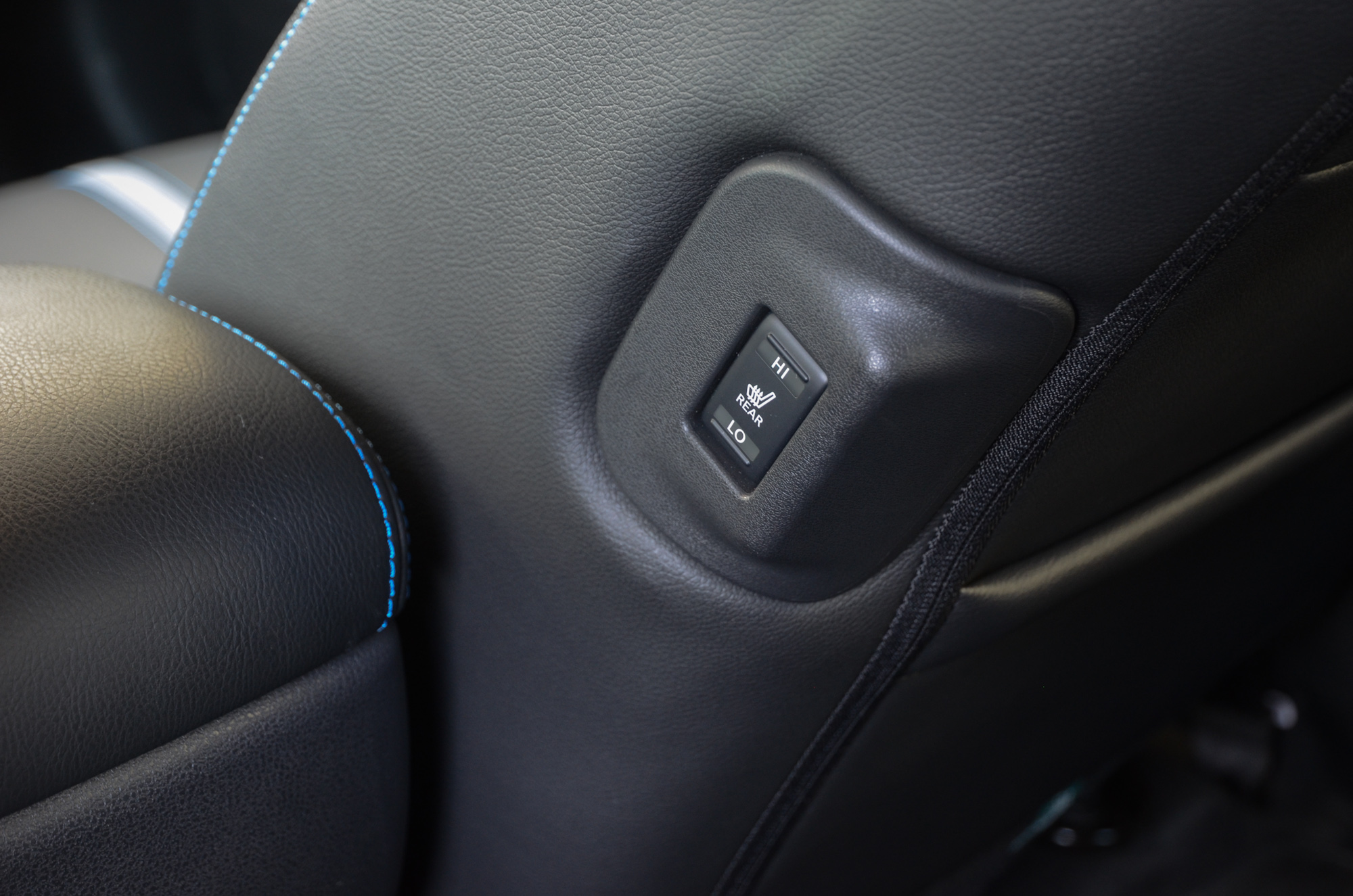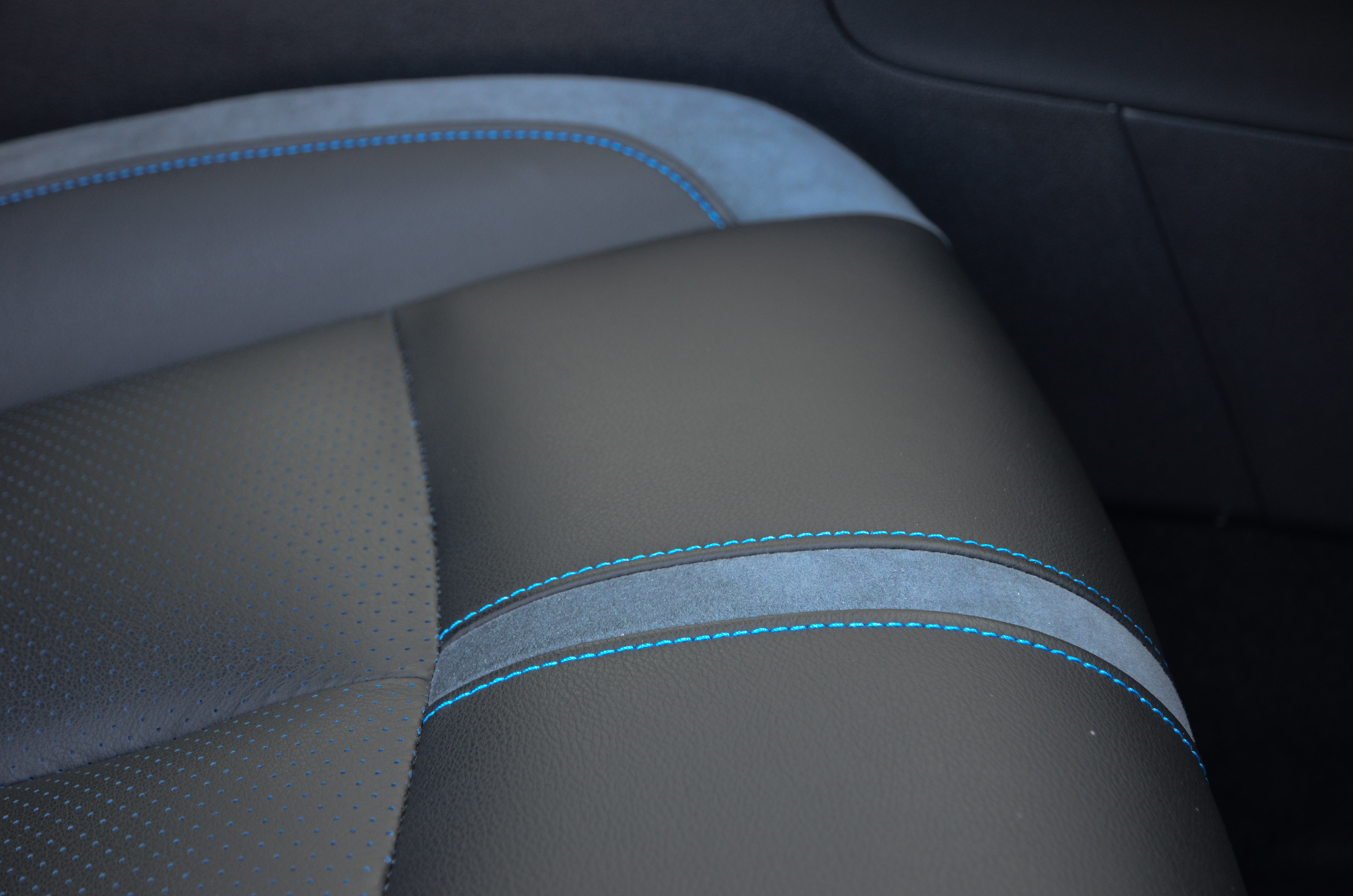 A helykínálat elöl és hátul is bőséges, a bőrülések stílusosan kék színű varrásokat kaptak