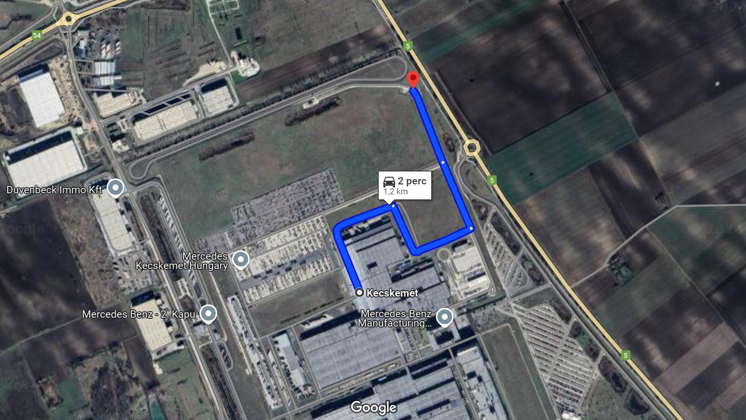 Elméletileg az ehhez hasonló üzemek minden egyes négyzetcentimétere be van kamerázva, illetve a biztonsági szolgálat emberei mellett a gyár egyéb dolgozói is észrevehették volna, hogy egy idegen járkál a munkaterületen. Mindez vélhetően nem pár percig tartott, a közleményt szó szerint idézve: "Addig-addig sétált, mígnem az utómunkára váró autók parkolójában kötött ki."Csak hogy mindenki tisztában legyen vele, a csoport többi tagjától több mint egy kilométerre kellett "kóborolnia" az autót elkötő egyetemistának ahhoz, hogy a tesztpályát megközelítse a Mercivel(Fotó: Google Maps)
