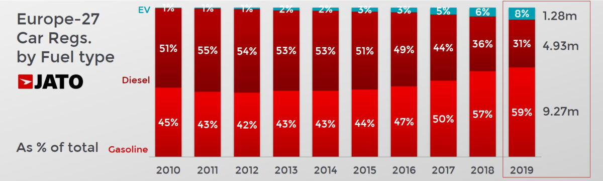 Villanymotorosnak nem csak a teljesen elektromos (BEV), hanem a hibrid modelleket is nevezhetjük. Igaz, közülük lényegében csak a full hybrid, azaz benzinmotorjuk mellett villanymotorjukkal is mozgásra képes hybrid (HEV) és ezek konnektoros változatai a plug-in hybrid (PHEV) modellek azok, amelyek érezhető fogyasztás- és emissziócsökkentést hoznak, a lágy hibridek kevésbé. A JATO Dynamaics összegyűjtötte, hogy a tavaly az Európában összességében 1,1 százalékkal bővült, hazánkban is 2007 óta nem tapasztalt szintre nőtt autópiacon miként alakultak az említett alternatív hajtású modellek eladásai. Összességében hatalmasat nőttek, hiszen míg a dízelek európai piacrésze 31 százalékosra esett vissza, az akkumulátoros, elektromos hajtást (is) tartalmazó modelleké 8 százalékra nőtt.
