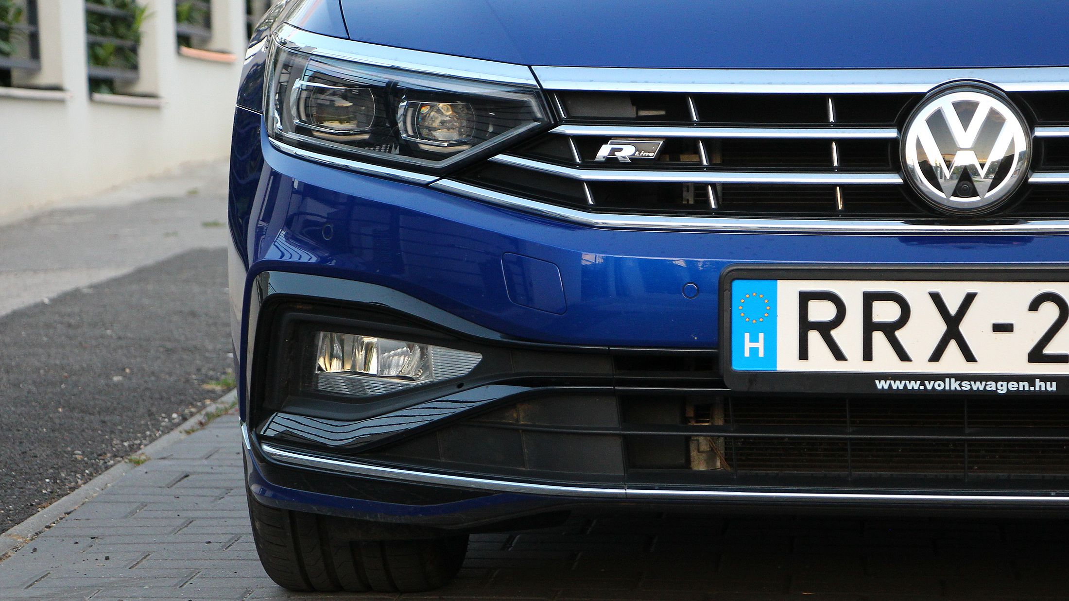 Minden porcikájából sugárzik valami józan kimértség. Még a 461 ezer forintos R-Line csomag sem tud ezen változtatni. Utóbbi lenne hivatott sportos felhangot kölcsönözni a Passatnak, de a baltával faragott formavilág sokkal inkább elegáns. Persze azért nem tolták túl ezt a bizonyos sportosítást. Egyedi, R-logós hűtőrács feszül az autó orrán, R-Line felirat díszeleg a sárvédőkön, illetve a 270 ezer forintos Lapiz-kék metál szín elősegíti, hogy az első lökhárítóban, a ködfényszórókat körbeölelő, fényes fekete betétek stilizált légbeömlőknek tűnjenek. Hátul a légterelőben végződő tető és a mind a két oldalra jutó kamu kipufogóvégek próbálnak sportos hangulatot csempészni az összképbe. A 18 colos könnyűfém felnik viszont nincsenek benne a csomagban, a tesztautón látható példányokért például 330 ezer forintot kérnek. Bár tény, hogy látványosabb R-Line csomaggal a Passat, azért rengeteget lehet faragni a tesztautó árából, ha kihagyjuk a listáról. De nem fogom most még elárulni, hogy milyen szám szerepelt az árcédulán, várd ki a végét!