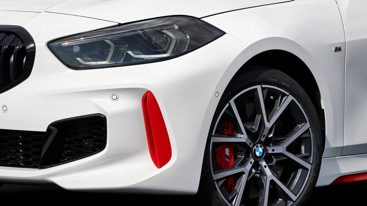 Legutóbb még csak álcázva láthattuk a BMW érkező új modelljét, most azonban lekerültek a fóliák minden új elemről. Megérkezett a 128ti, mely külsőre és némileg belső tartalomra is az M135i csúcsmodellt idézi. Az új sportosabb, de nem a legélesebb 1-es külső kiegészítő elemei pirosban díszelegnek, ilyen az első lökhárítókba épített levegőbelépő, valamint a hátsó lökhárítókba került szellőzők rácsai, valamint a küszöbdíszléc betétje is. A 128ti-t ezekről is könnyű lesz megismerni, de még a hátsó kerekek elé is kerül piros ti felirat. Ezek piros, vagy kék fényezés esetén feketében kerülnek fel az új modellre.