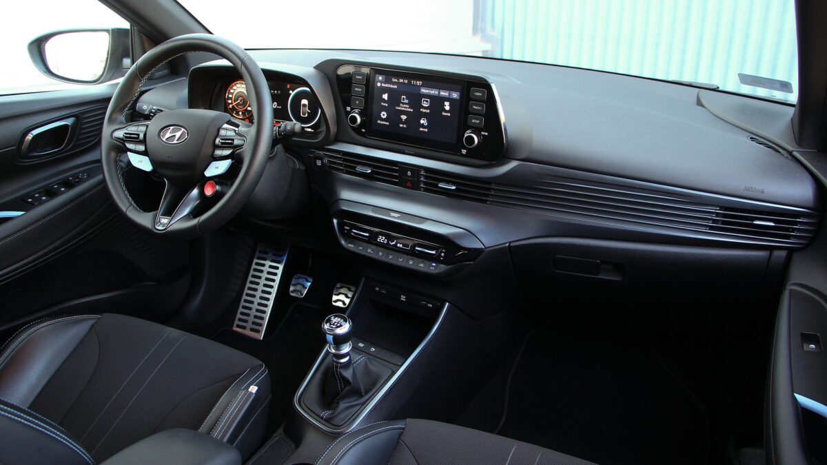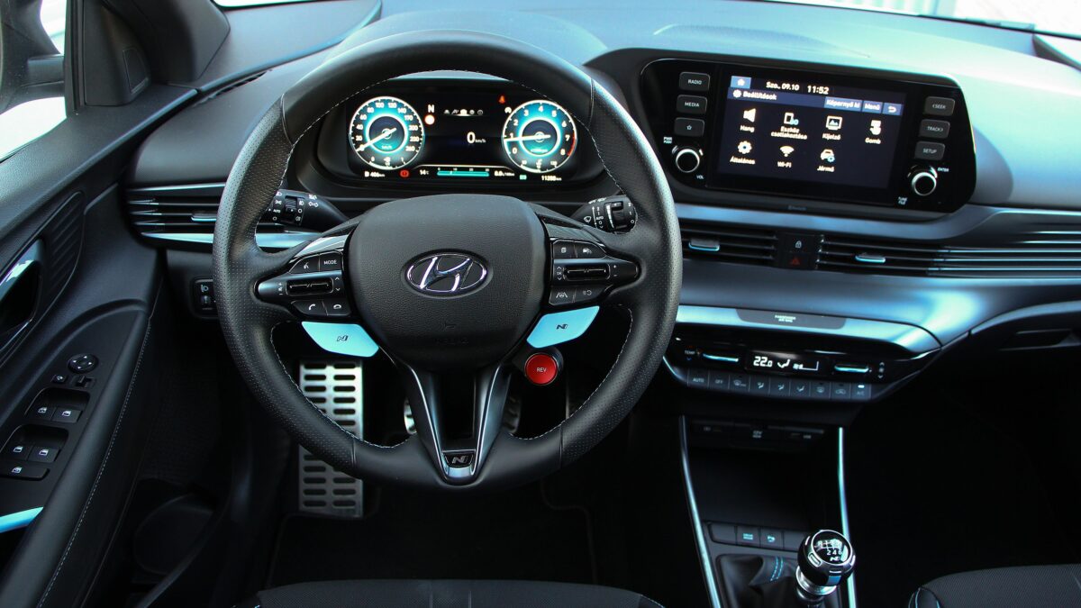 Bent már nem szárnyalt annyira a fantázia, néhány kék díszítés, illetve a kék cérna alkalmazása oldja a szürkeséget. Hívogatóak a kék gombok a sportkormányon, na meg az a piros is, ezekre hamarosan kitérek. Természetesen járnak a fém pedálok és a sportülések elöl, fejtámlájukban N jelöléssel. Funkciójukat tökéletesen ellátják, tartanak rendesen, derékban és combtájon is. A hatfokozatú, manuális sebességváltó gombjára is jutott egy kis kék dísz, amúgy meg tökéletesen illik a sofőr markába. A szeme előtt pedig 10,25 colos digitális műszeregység kapott helyet, amelyen az üzemmódtól függően más a színvilág, de mindegyiknél szép a grafika, könnyű a leolvashatóság. Ugyanez igaz a 8 colos, érintőképernyős infotainmentre is, amelynek menürendszerében könnyű navigálni. Habár nem követelmény egy sportos masinánál, de az i20 N ötajtós maradt, így hátra is könnyű beszállni, de itt azért a szokásos kisautós helykínálat vár, viszont a csomagtér is jól használható, hiszen alapból 352 literes.