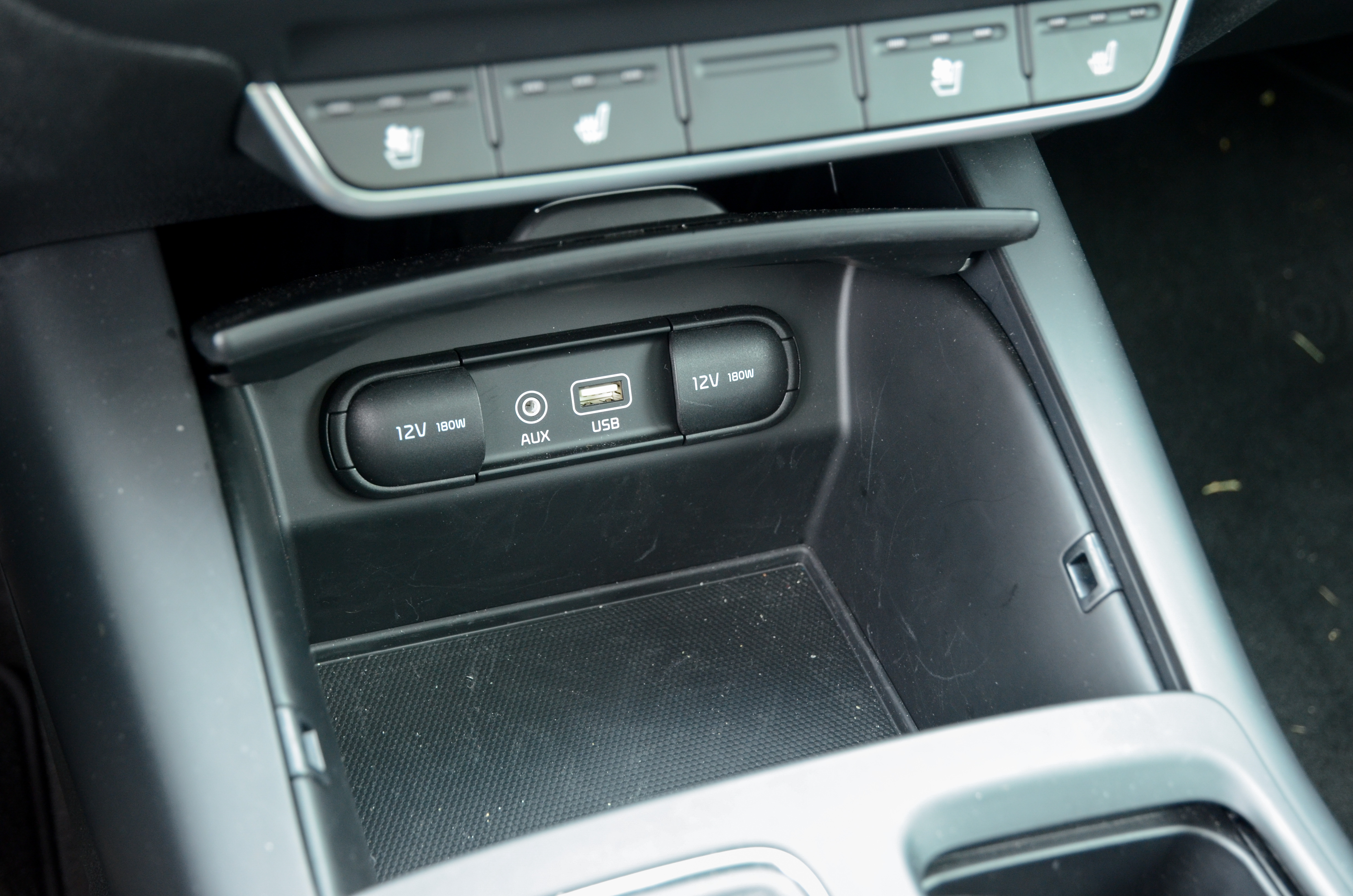 A középkonzolban bőséges méretű tárolórekeszek kaptak helyet. Elöl az USB és AUX mellett dupla 12V-os csatlakozó is helyet kapott
