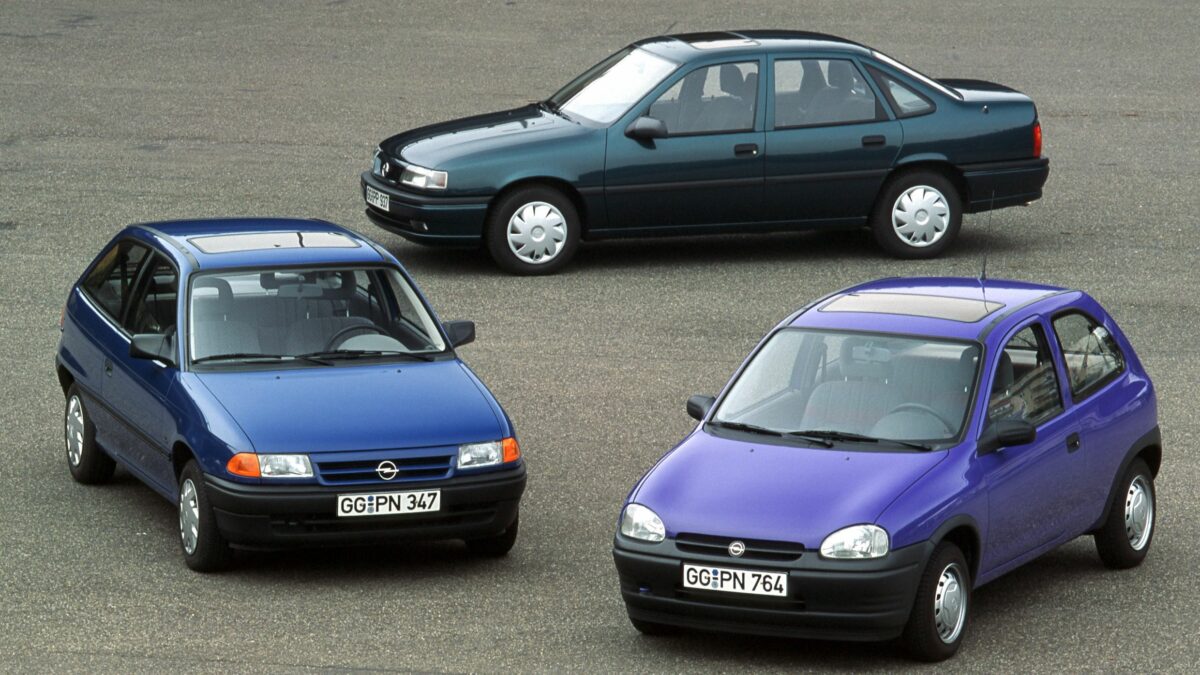 Már több mint félmillió Opel fut a hazai utakon, a fotón a kilencvenes évek villámosai: az Astra (F), a Corsa (B) és a Vectra (A)
