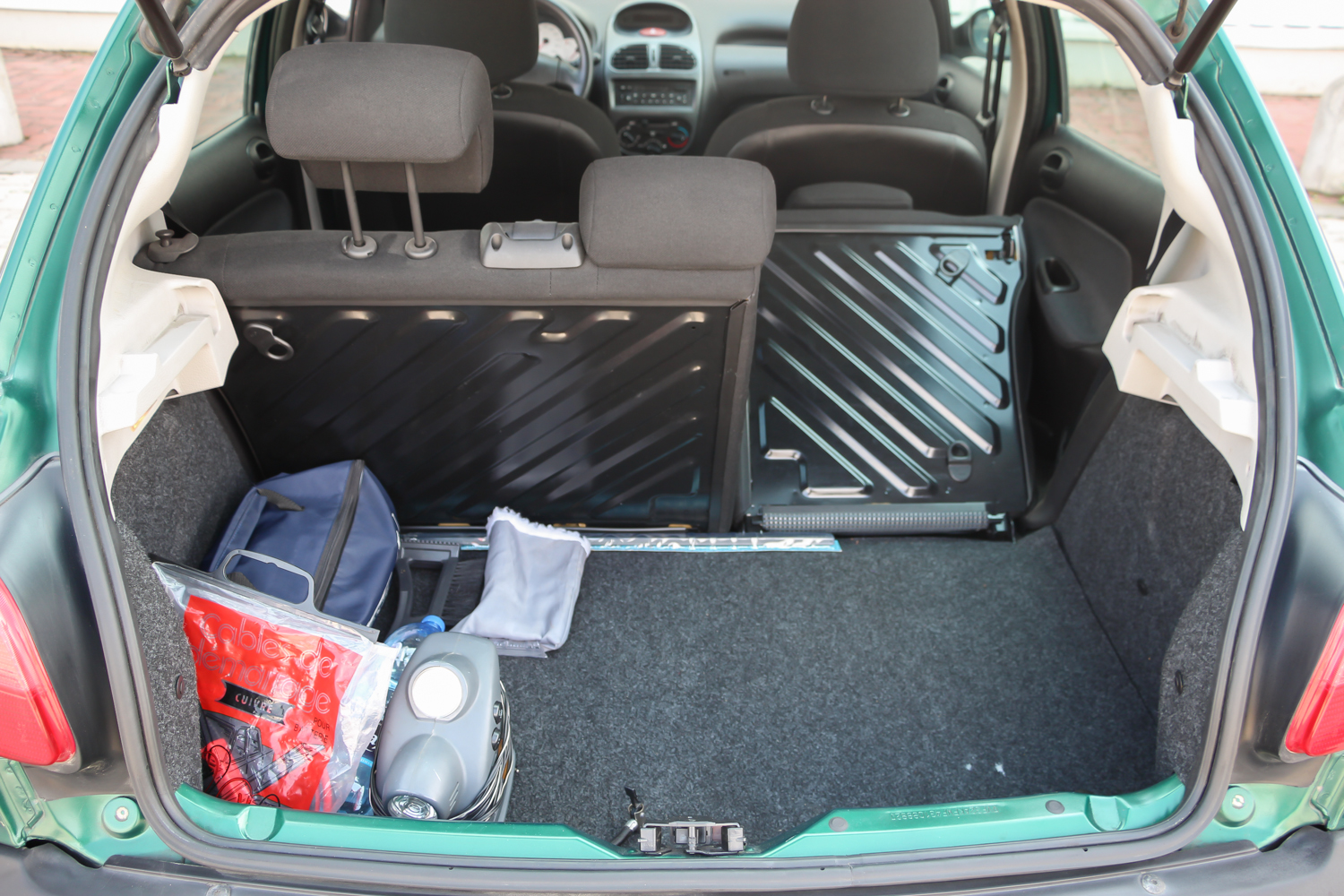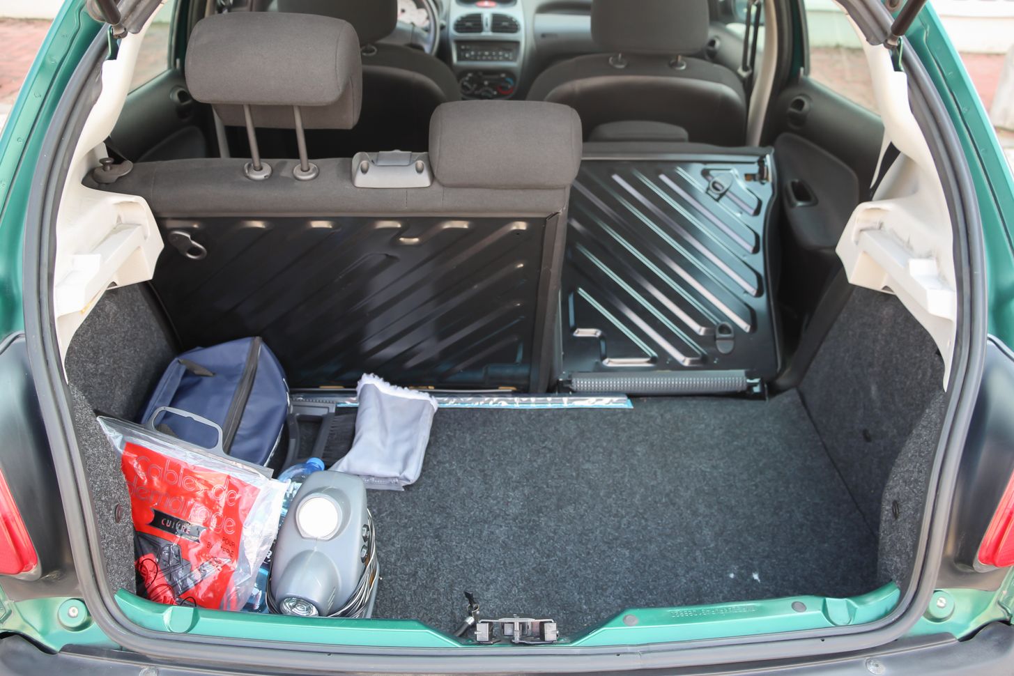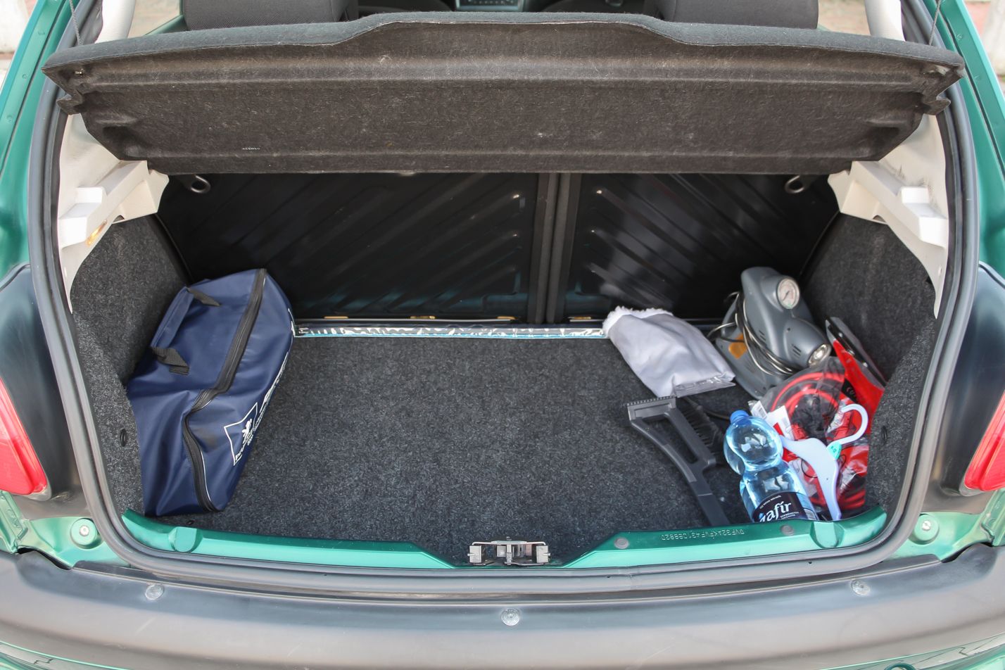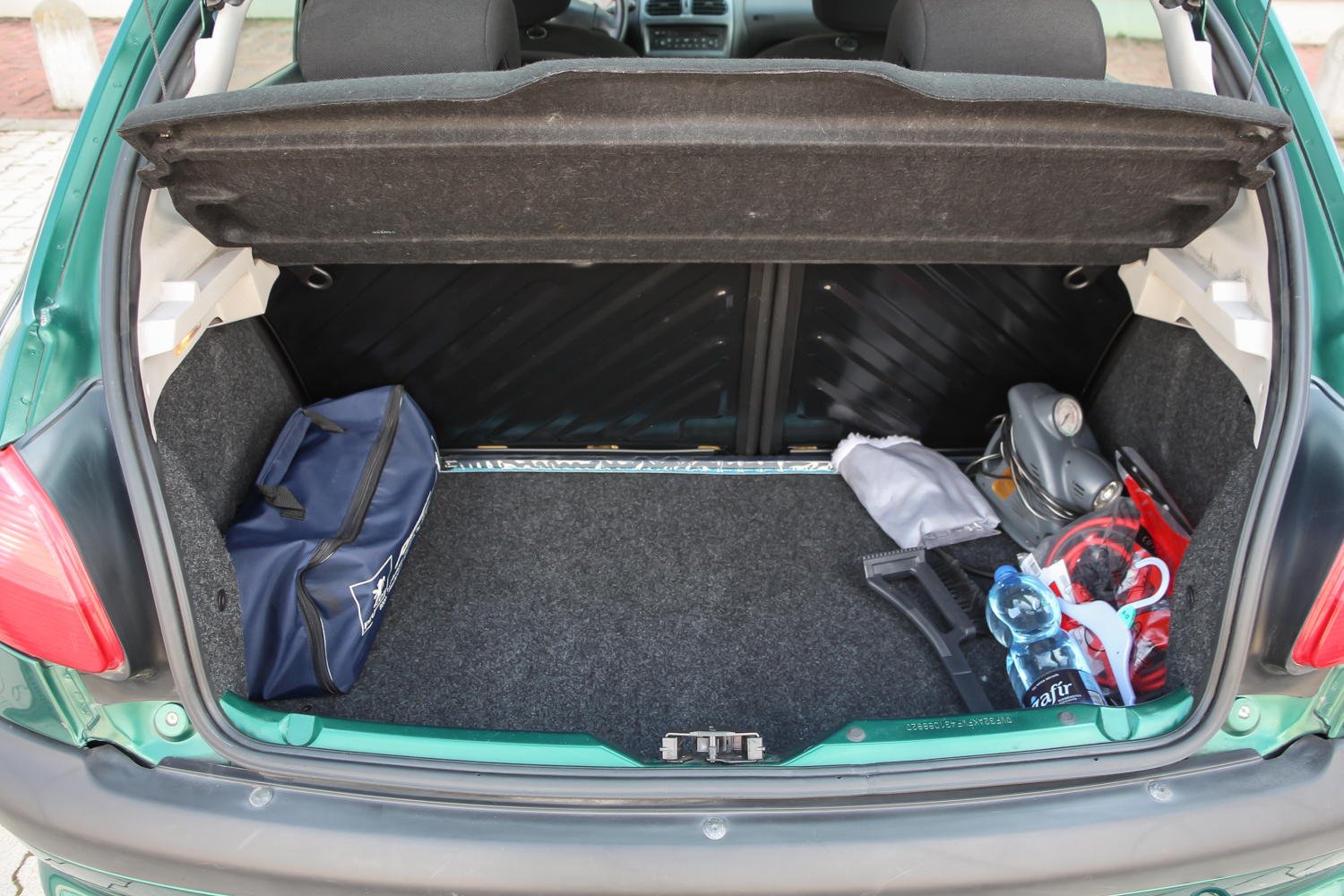Nem túl nagy, csak 245 literes a csomagtartó. Bővíteni ülésdöntéssel könnyen lehet, és akkor befér a lapra szerelt bútor is. A bikakábelt és a szivargyújtóról működtethető kompresszort soha nem használta az autó hölgytulajdonosa