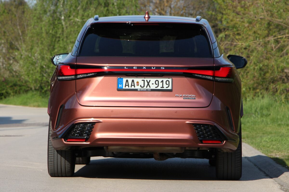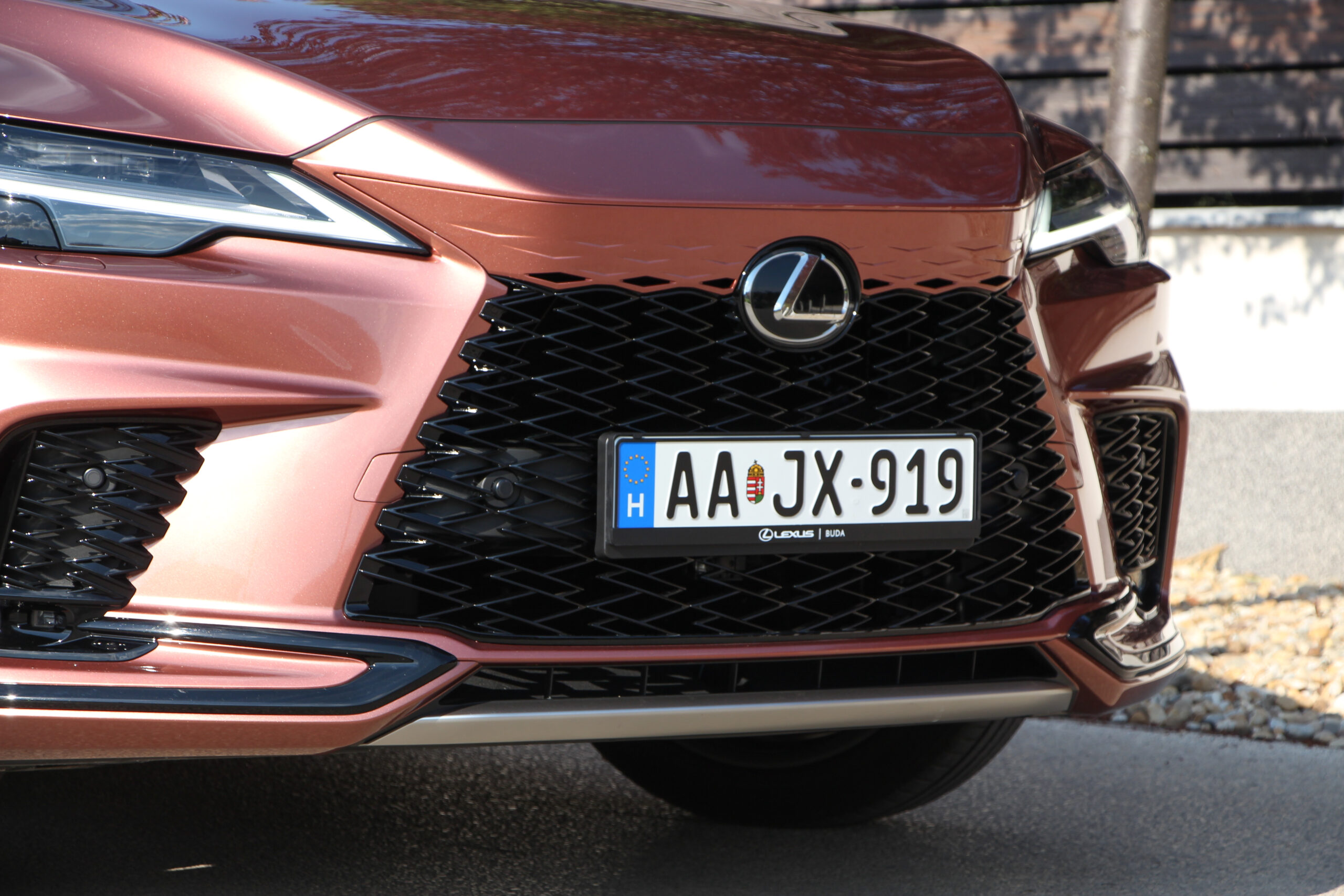 Habár megkapta az 500h az F Sport csomagot, ami a sportos génállományt jelenti, azért ez az autó még mindig jóval inkább az eleganciáról és a különlegességről szól. A formaterv továbbra is rendkívül látványos. Elöl újragondolták az orsó alakú hűtőmaszkot, amitől kicsit marconább, kicsit komolyabb lett az RX arca, de még mindig ügyesen bántak az ívekkel, fény-árnyék vonalakkal, szóval ismét az a helyzet, hogy órák hosszat lehet szemezni vele, miközben újra és újra felfedezhető rajta egy-egy addig észre sem vett formai bravúr.