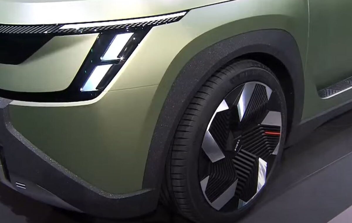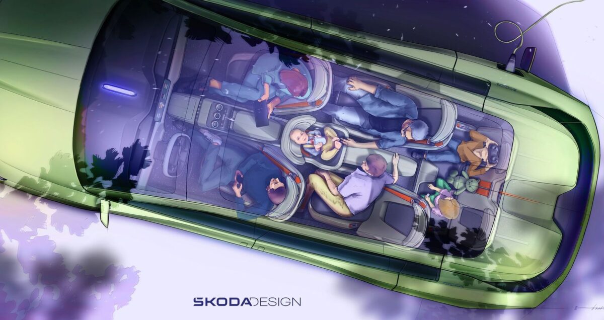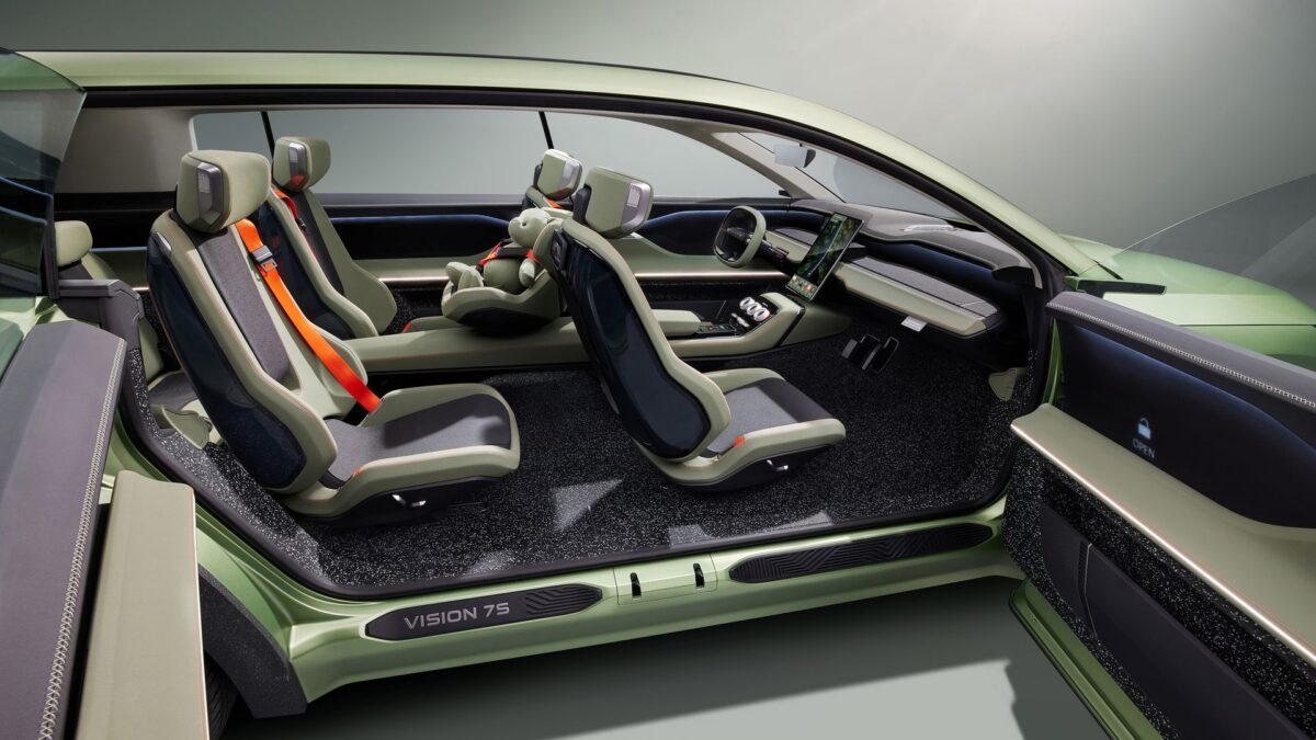 egy másik teaser fotón egy nem éppen szabványos műszerfalat is villantottak nekünk. Utóbbi némiképp módosult, de a hatása ugyanolyan futurisztikus mint a skicceken szereplő variánsnak. Amellett, hogy jól néz ki, ennek az autónak is nagyrészt újrahasznosított anyagokból áll a beltere, példának okáért a padló újrahasznosított gumikból készült. Villanyautóként előkerült a töltési idő átvészelésének kérdésköre is, ám erre a Škoda szintén kreatív válasszal szolgált: a Vision 7S belterének van egy olyan beállítása, amit utazás közben használ a rendszer, és egy olyan, amit töltés közben. Utóbbi esetben az érintőképernyő eltűnik a műszerfalban, valamint az ülések átrendeződnek, így töltés közben egy sokkal komfortosabb közeg várja az utasokat.