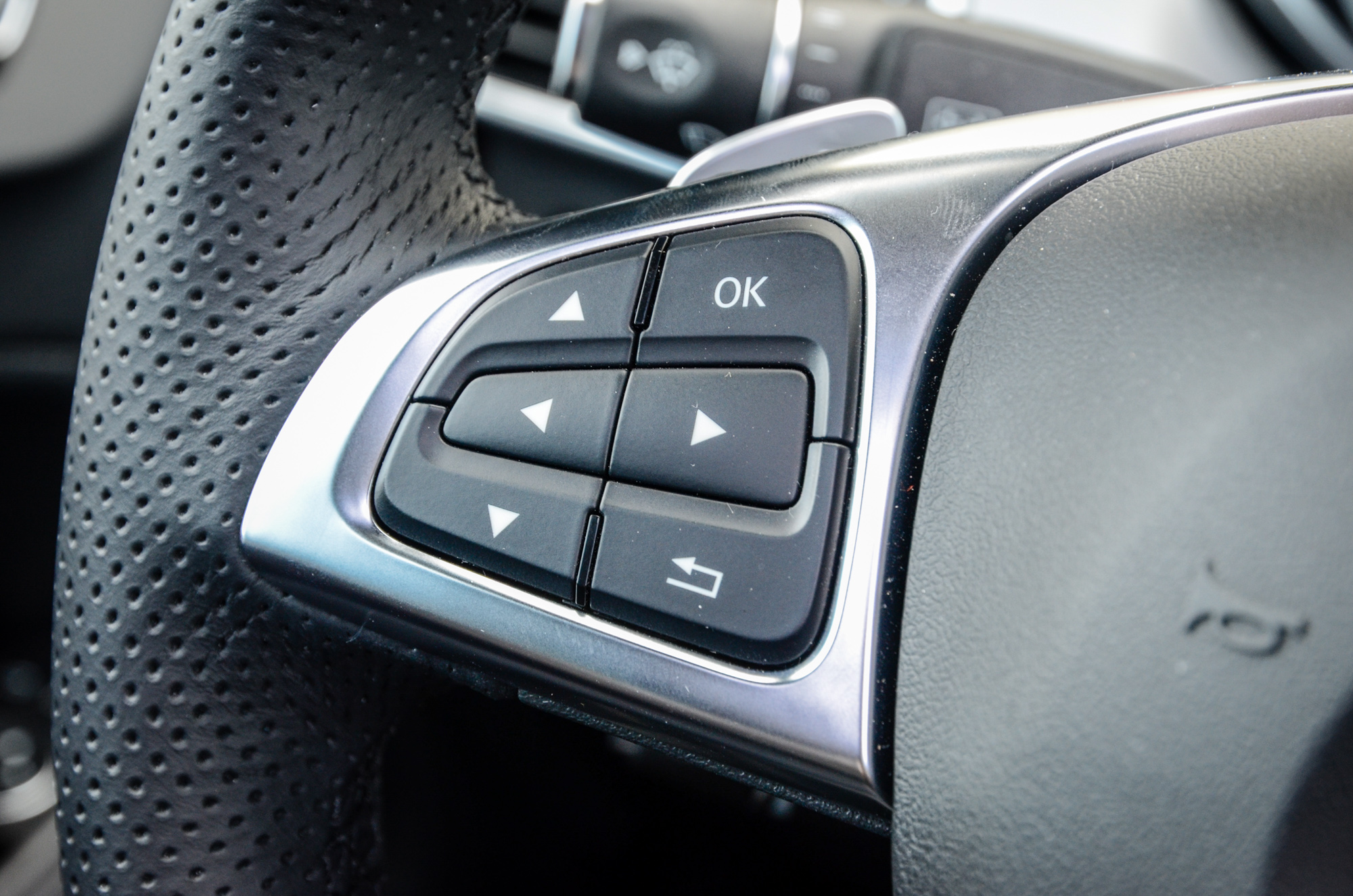 Más, mint a többi. Ez már első ránézésre is feltűnik, ami egy AMG sportcsomagnál nem is csoda. Masszív első hűtőmaszk, hatalmas Merci csillaggal, alatta sportos lökhárító. Fekete színre fényezett külső visszapillantók, 21 colos felnik, hátul szintén sportos lökhárító, alul ügyesen négynek álcázott dupla kipufogóval. Belül talán még inkább érezhető a sportosság. Vaskos oldaltartású bőrülések, perforált bőrrel borított, alul egyenesen csapott sportkormány, alupedálok és kontrasztos, piros varrás árulkodik az AMG felszereltségről.