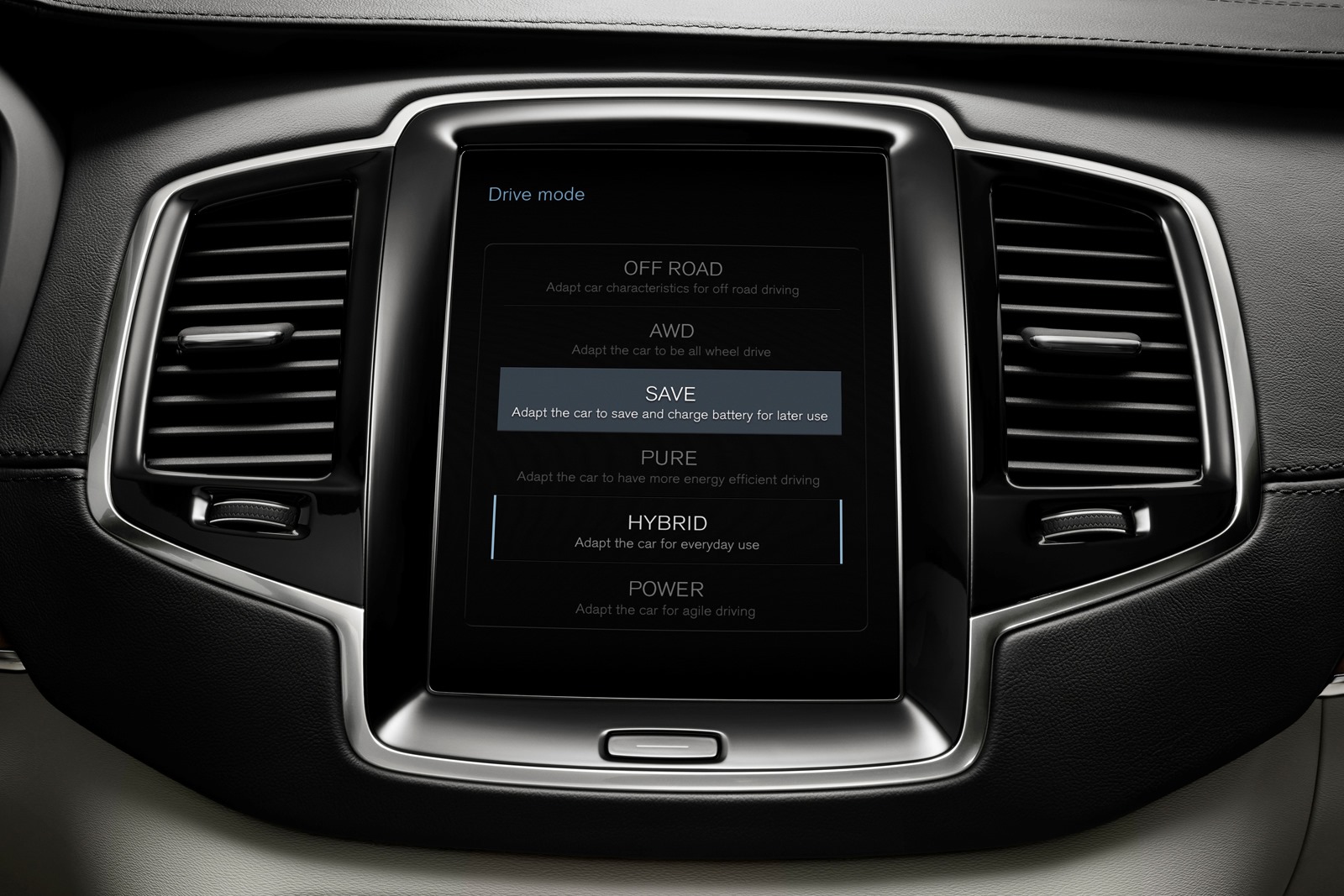 Ha a vezető úgy kívánja, akkor csöndes és emissziómentes is lehet a 400 lóerős plug-in Volvo, 40 kilométert tud megtenni tisztán elektromos üzemben. Az erős és mégis takarékos T8-on kívül persze több hagyományos hajtásrendszerrel is rendelhető lesz az új XC90-es. A Drive-E motorcsalád máshonnan már ismert tagjai közül a D5 változat duplaturbós dízelje 225 lóerős lesz és 470 Newtonméter nyomatékkal az autó karakteréhez talán legjobban passzoló motor. Fogyasztása ráadásul 6 liter körüli a Volvo ígérete szerint. D4 változatban 190 lóerővel (400 Nm) még kedvezőbb, csak 5 literes az átlag. Aki a benzinesre szavaz, választhatja a T6 kivitelt, ami az előzetes információk szerint 320 lóerős és 400 Nm nyomatékú, vagy a T5-öt 254 lóerővel és 350 newtonméterrel. A T6 motorja teljesítményadatai alapján feltehetőleg meg fog egyezni a T8-éval.