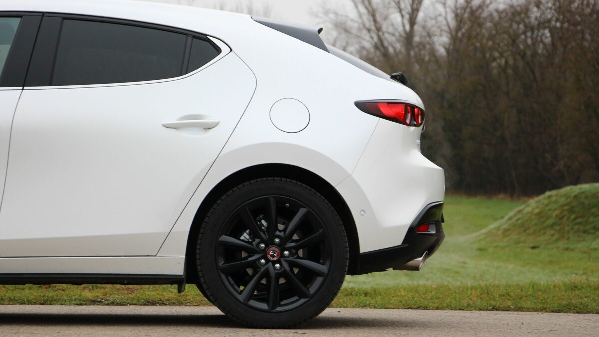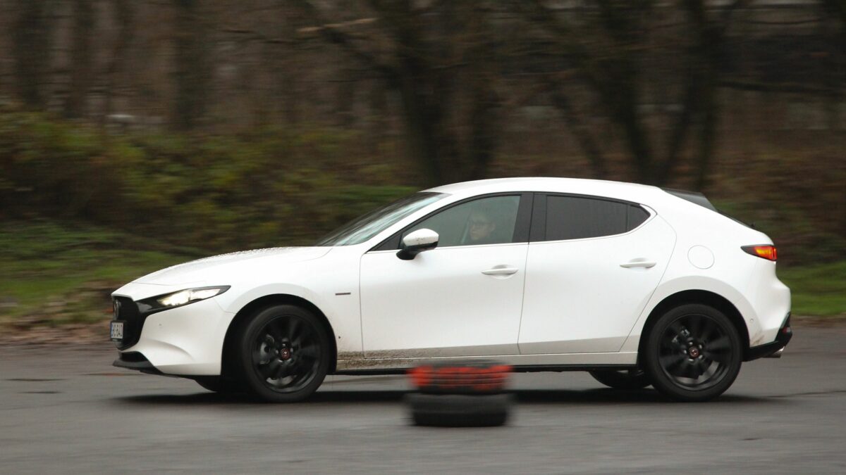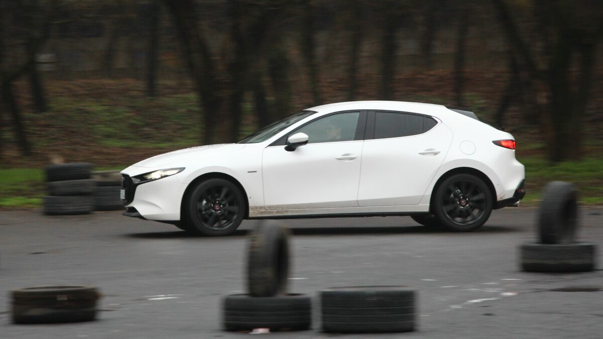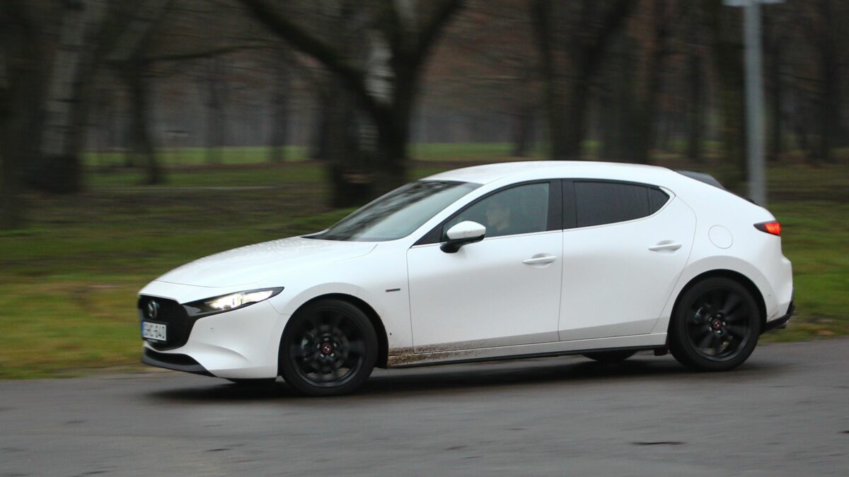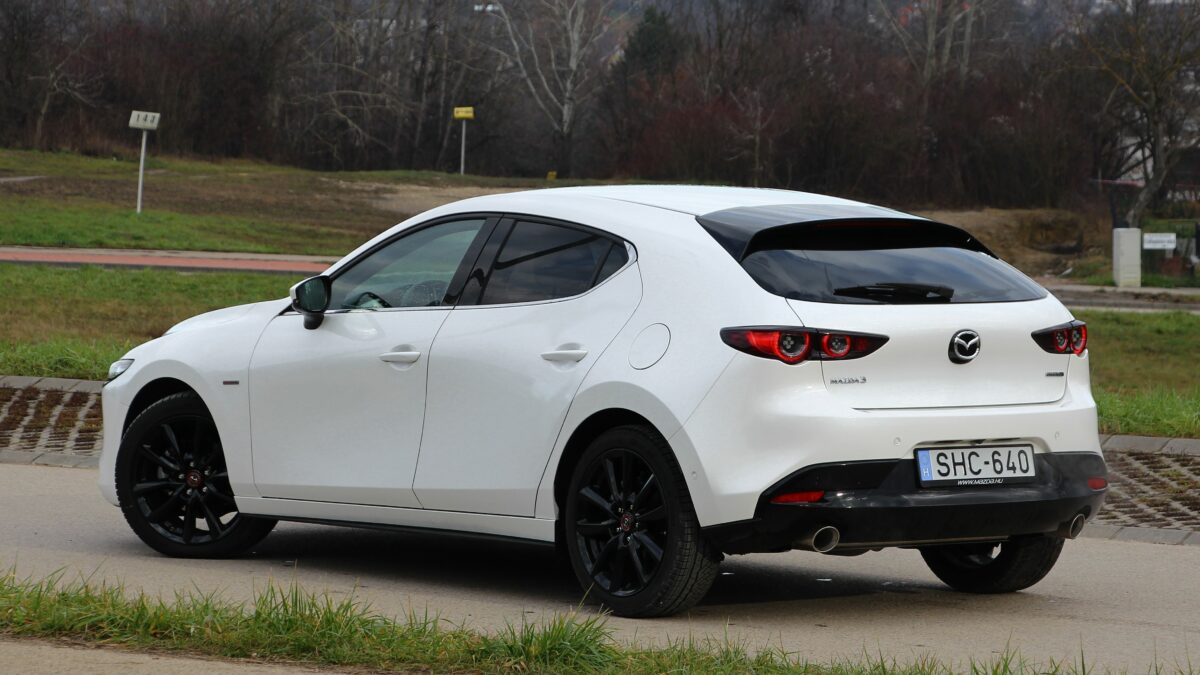 Eleinte kicsit nyomatékszegénynek tűnik, aztán erőre kap, de nincs kimondottan olyan pont, amikor azt mondanám, hogy na most jött meg igazán az erő. Ugyanazt érzem háromezres fordulatnál, mint 4000-nél, ha a gázpedálba taposok. Szép egyenletesen gyorsul, nem passzíroz az ülésbe, de nem sereghajtó a lámpánál elindulva. Sőt, még ötödik fokozatban is szépen meglódul, ha kell, de többnyire a hatodikban pihen majd a váltó, hiszen nem ritkán már 50 km/h tempónál is kéri a hatodikat. Kéri és tűri, alacsonyan tartva a fordulatot, spórolva az üzemanyaggal. Ebben a lágy hibrid rendszer is segít, amely már ebben a hajtásláncban is szolgál. Szóval egy kényelmes utazóautó a Mazda3, hiába sportosan alacsony az üléspozíció is. A futóművet ugyan inkább a feszesebb irányba hangolták, de ügyeltek rá, hogy ne váljon túl rázóssá, bár a 18 colos felnikkel azért nem szereti a hepehupás aszfaltot. A kormány kimondottan közvetlen, viszont a tempós kanyarokban jól érezhetően, hamar alulkormányozottá válik, ami újfent a higgadt vezetési stílusnak kedvez.