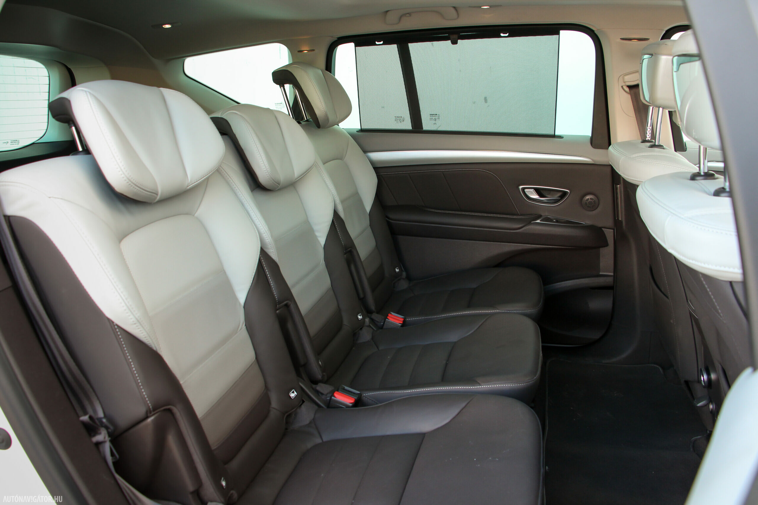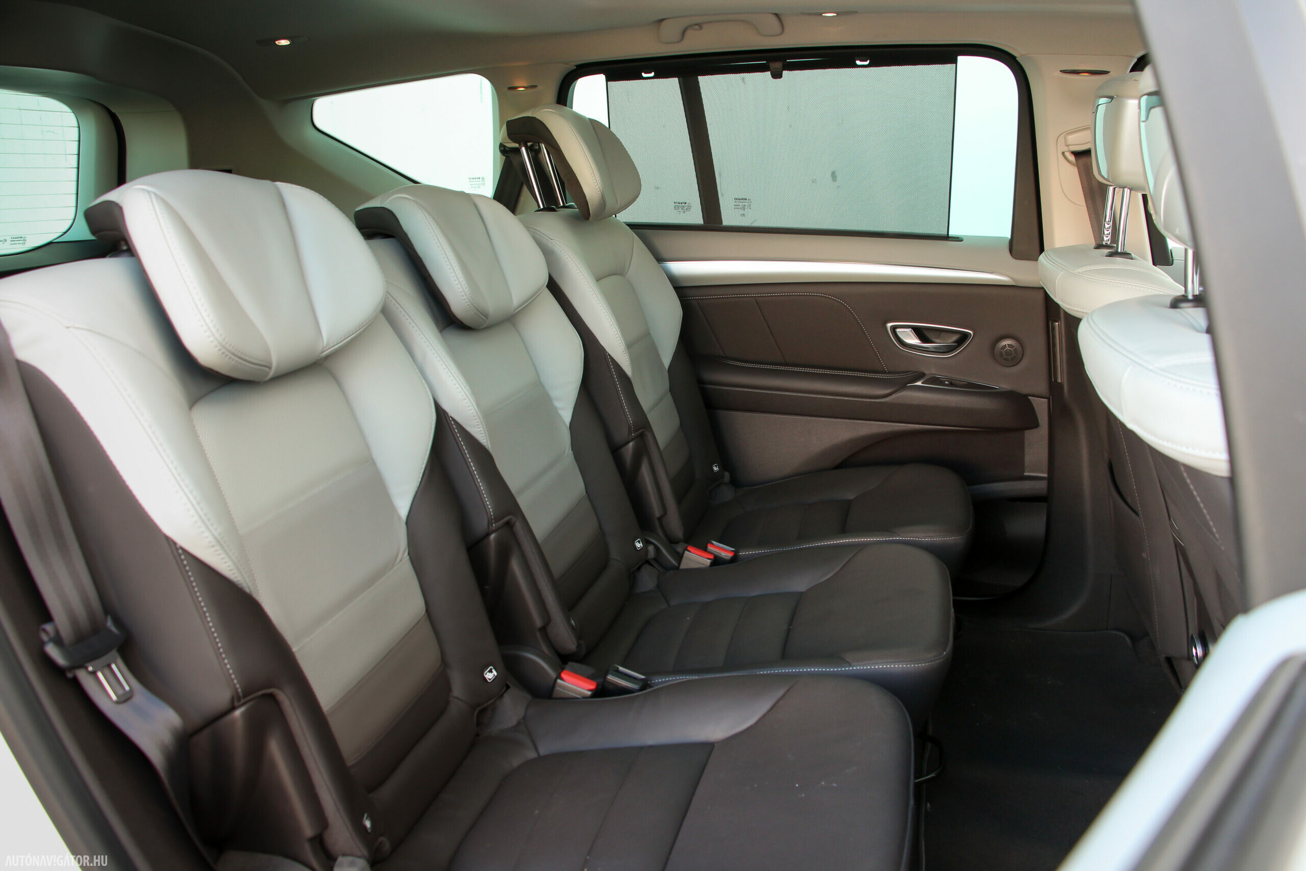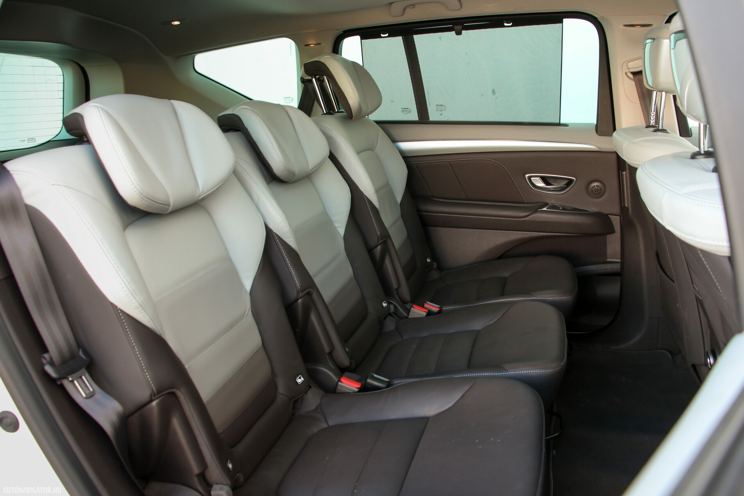 Általában nem vagyok a fullextrás verziók híve, de az Espace-hoz nagyon illik a csúcskivitel. Tér mindenképp van benne bőven, ehhez pedig nagyon passzol ez a szalonhangulat. Az első ülések vaskos oldaltámaszukkal, állítható laphosszukkal, valamint fűtésükkel, szellőztetésükkel és masszázsukkal hosszú távokon is kényeztetők. Hátrafelé haladva csökken az ülőlapok hossza, de a második sorban még elég kényelmesen lehet utazni, akár hárman is egymás mellett. Ott mindhárom ülés Isofix csatlakozós, mivel egyenként tologathatók is, valóban be is lehet tenni három gyerekülést. Ha csak szűk mértékben, de a támlák dőlése is szabályozható. A harmadik üléssorban maguk a székek nem rosszak, hely viszont nagyon kevés jutott oda, persze rövidebb távokhoz, pláne gyerekeknek teljesen megfelelők. Jó pont, hogy csomagtér még hét ülés mögött is van annyi, hogy egy egynapos kirándulás, strandolás cucca simán beférhet. Ha pedig csak négyen-öten megyünk, bőségesen elég a második sor mögött 614 literes csomagtér.