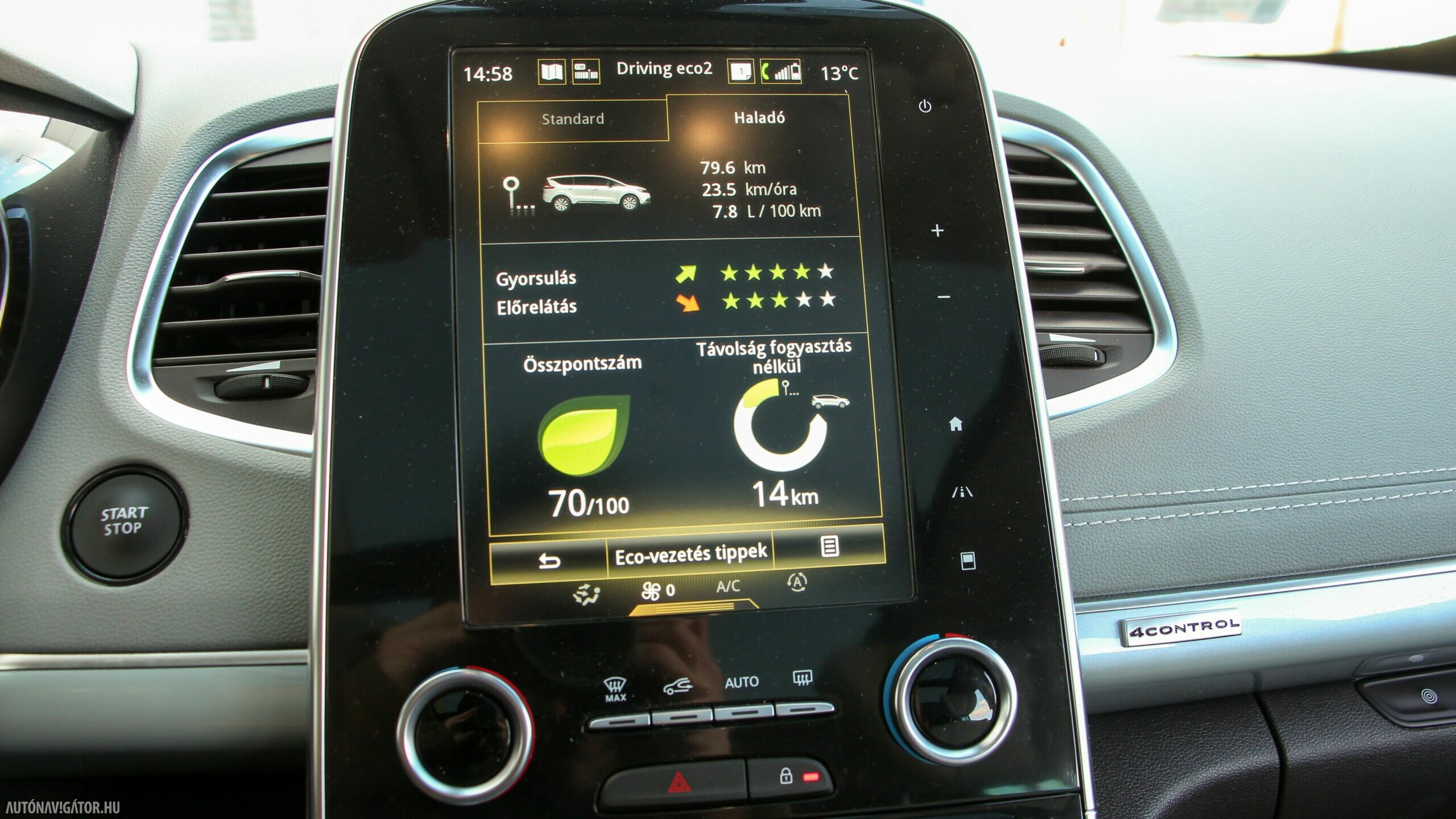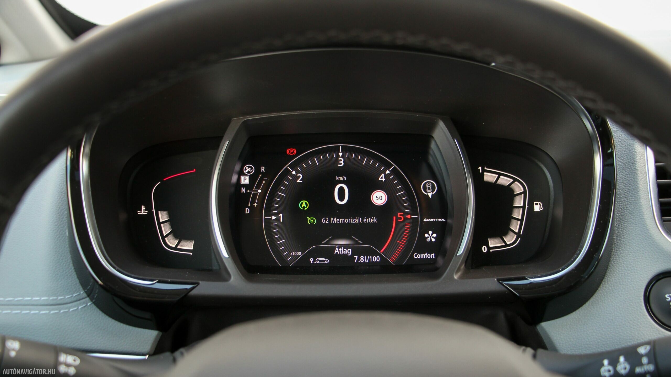 Sofőrsegédből sávelhagyásra és alacsony követési távolságra figyelmeztetés van, meg persze aktív vészfékrendszer, távolságtartós tempomat azonban csak felárért jár, head-up display-jel együtt. A tempomat/sebességkorlátozó itt még a régi Renault iskola szerinti, középkonzoli főkapcsolós, amit én egyébként kifejezetten szeretek, mert nem kell minden indítás után bekapcsolni, mint a frissebb modellekben.