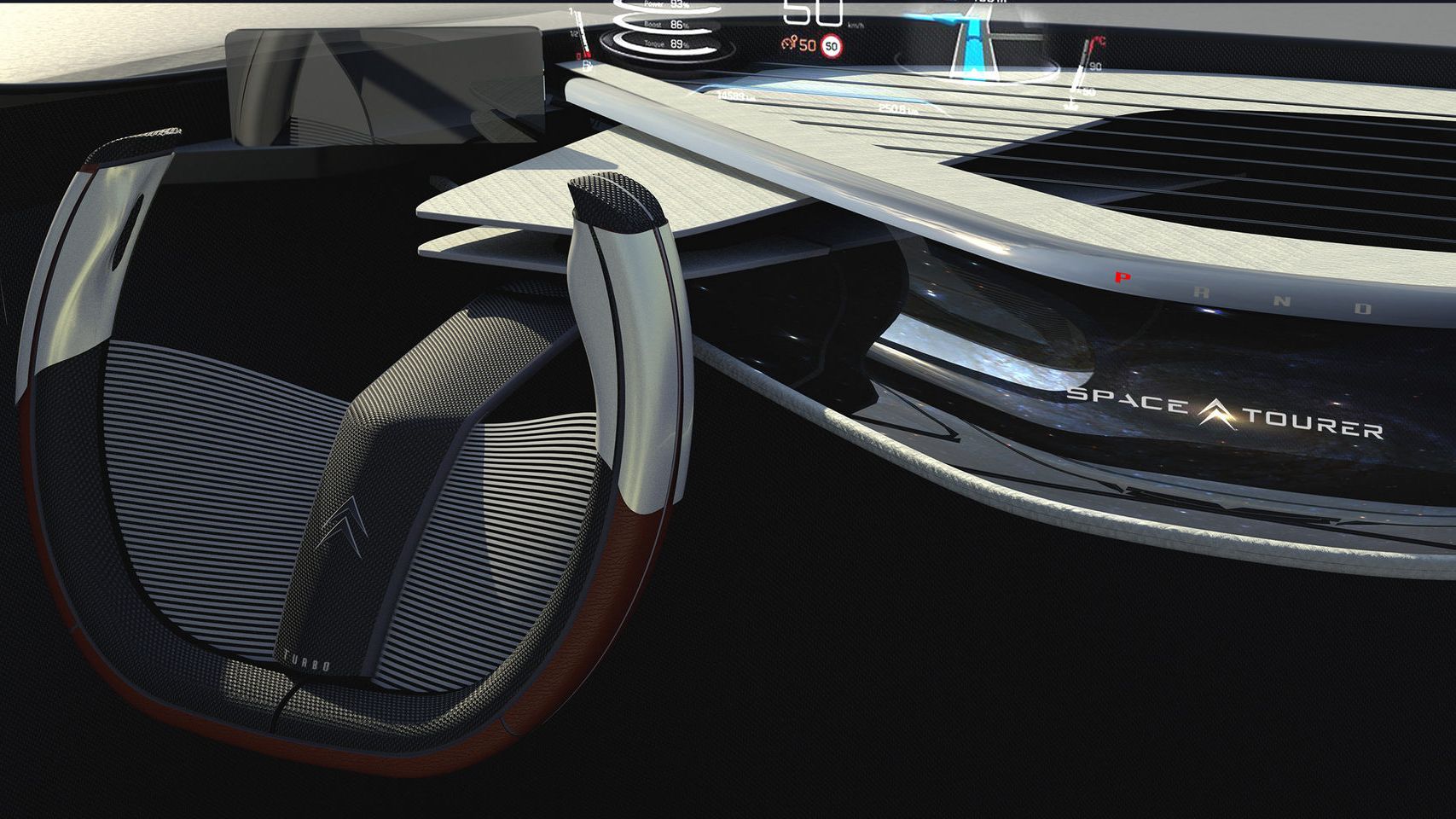 Mindezeket elég jól sikerült megvalósítani a Space Toureren. Oldalnézetből az autó felső részét képező üvegbuborék a ráeső fényből ovális alakot tükröz vissza, míg az ajtók hajlítása miatt a sötét és világos felületek közti kontraszt fontos motívum az első sárvédőktől a hátsó kerekekig tartó, dinamikusan lejtő vonalvezetés formájában. Ez utóbbi egyébként a klasszikus, 80-90 évvel ezelőtti autók sárvédőit idézi, bár ott általában csak az ajtók küszöbéig tartott a sárvédő lejtése, nem pedig végig a kocsi oldalán. Az ajtók egyébként hátrafelé csúsznak, mint a kisbuszokon, és nem láthatunk a karosszéria elemei között törésvonalakat, ami persze jól néz ki látványterveken, de nyilván kivitelezhetetlen a valóságban. A dinamikusan hátranyúló formát visszapillantó tükrök nem törik meg, apró kamera emelkedik ki oldalról, ha szükség van rá. A jövőt idéző koncepcióhoz persze a Michelin fejlesztés alatt álló, levegő nélküli gumiabroncsai járnak. Elöl és hátul is minimalista a kialakítás, hatalmas Citroën emblémák díszítik a járművet, de a fényszórók alig látszódó csíkok, amik viszont így nem törik meg a tanulmány spirális és ovális összképét. Kifejezetten izgalmas munka lett ez a Space Tourer, ugyanakkor talán hiányzik belőle néhány olyan részlet, ami valóban a Citroënhez kötné a koncepciót az emblémákon kívül: nyomát sem látjuk a márkára jellemző furcsa, ötletes és érdekes megoldásoknak vagy vizuális elemeknek.