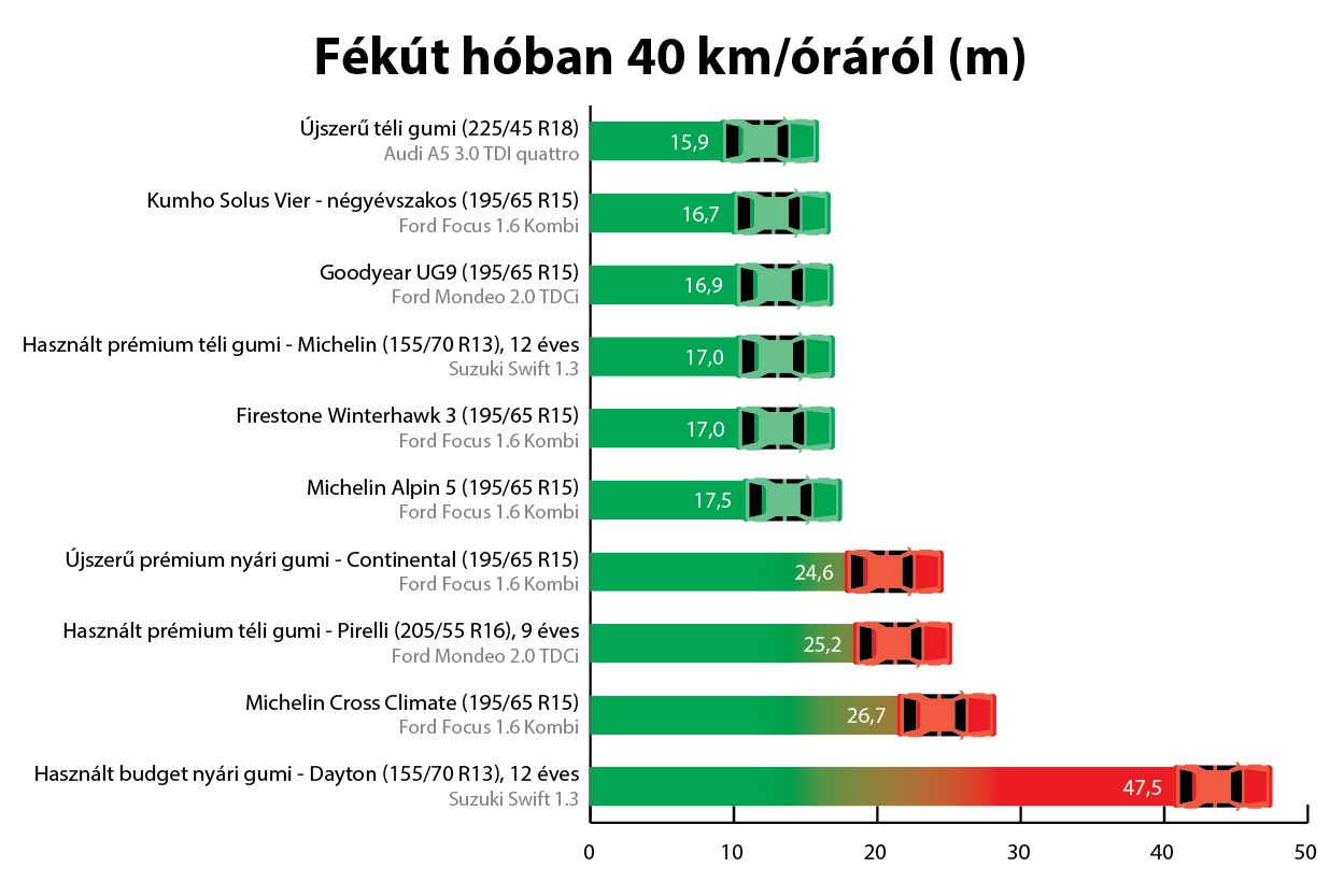 Nem elegendő télire, jó télire kell: 4 mm profilmélység alatt minden téli abroncs cserére érett, ahogyan egy már 5-6 szezont végigszolgált is. A gumiabroncsnak ugyanis mind az UV sugárzás, mind a téli útsózás ártalmas. Ezért aztán mind a nyári, mind a téli abroncsokat tisztán, napfénytől és hőtől védett helyre érdemes elrakni, felnin egymásra fektetve, anélkül állítva, de időszakosan átforgatva. A gumitárolásról itt olvashatnak bővebben, gumitesztünket pedig nem csak azoknak érdemes átolvasniuk, akik most új szettet vásárolnak, hanem mindenkinek. Egyértelműen mutatott mérési eredményeinkkel rávilágítunk arra, hogy télen miért kell a legjobb téli gumival is fokozott óvatossággal vezetni, már a legjobb tapadást, így a legrövidebb fékutat adó száraz aszfalton is.