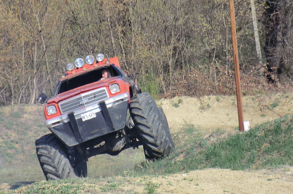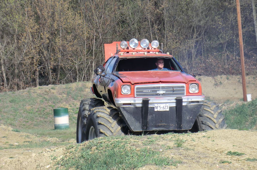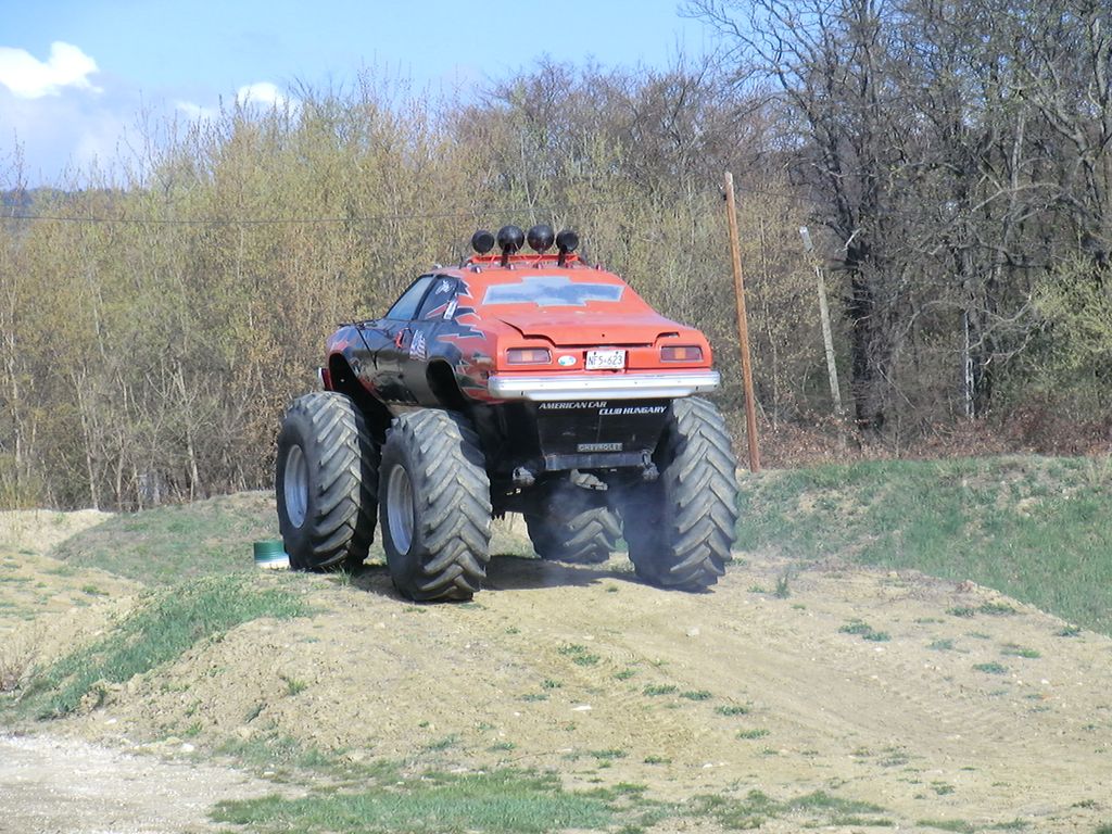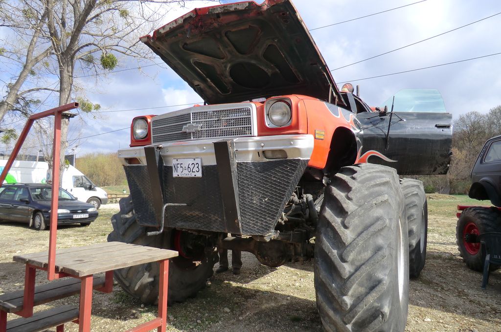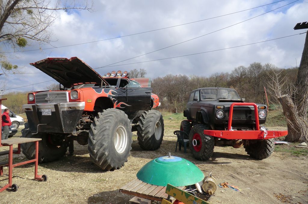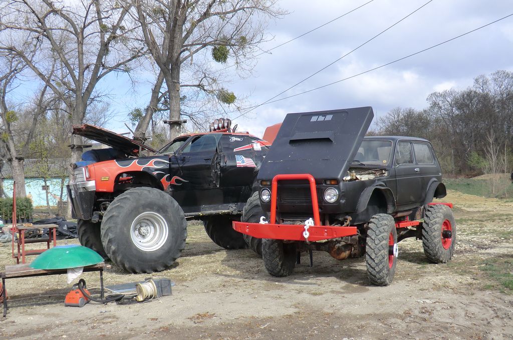 Eltörpül a hatalmas kerekű Chevrolet Malibu karosszériás bigfoot mellet a Lada Niva, pedig azonos alapra, a GAZ 66 katonai teherautó-terepjáró alvázára épülnek