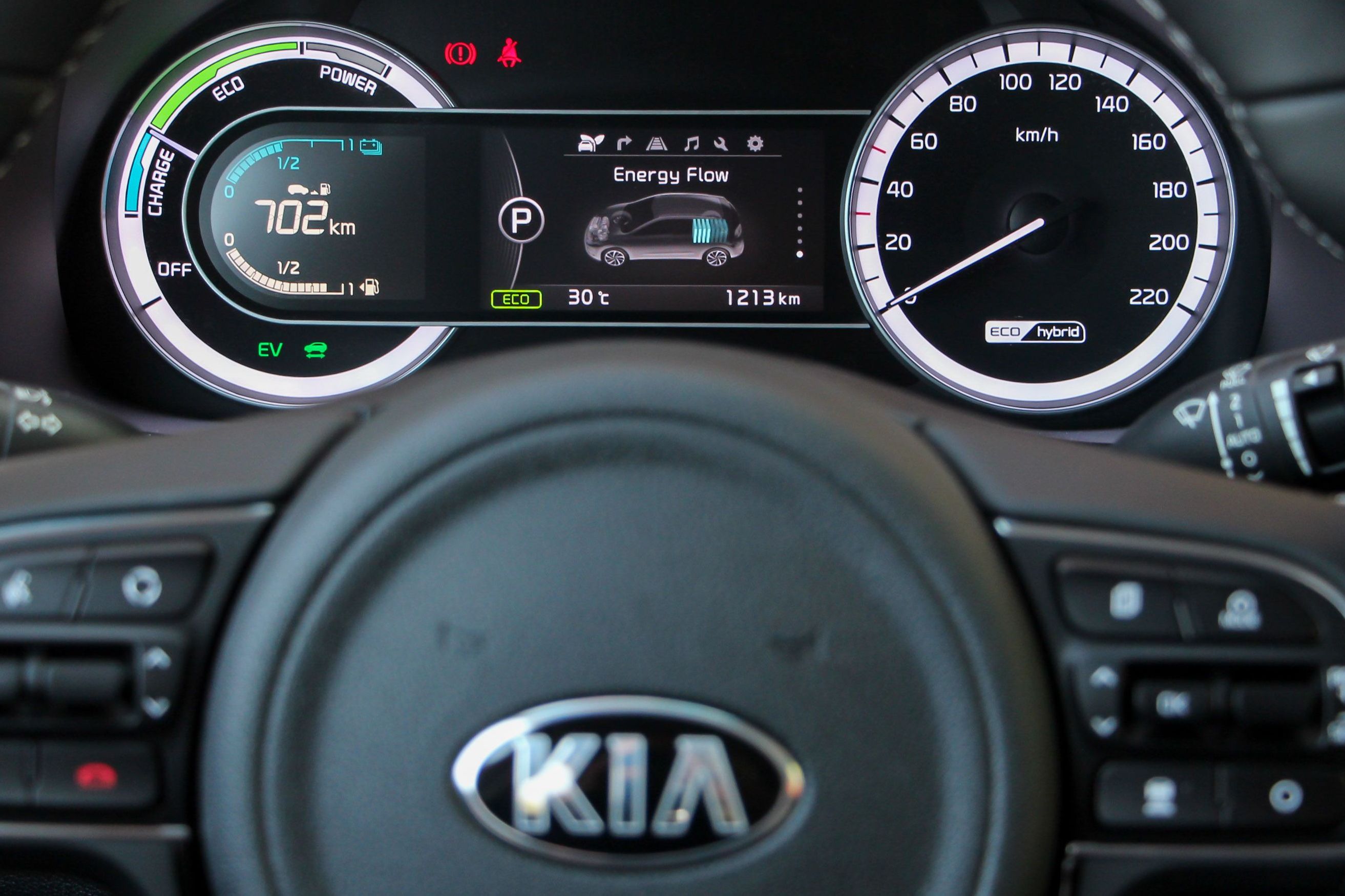 A műszerblokkban lévő TFT kijelzőn a kényelmesen nagy (gyári fogyasztási értékkel számolva több mint 1000 kilométeres hatótávot adó), 45 literes üzemanyagtartály és az 1,56 kWh-s lítium-ion polimer akkumulátor töltöttsége is látható, de középső részére természetesen a hajtás/energiaáramlás sémája, a navigáció vagy akár a sofőr vezetésének értékelése is látható.