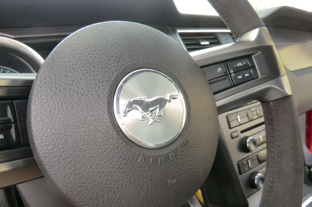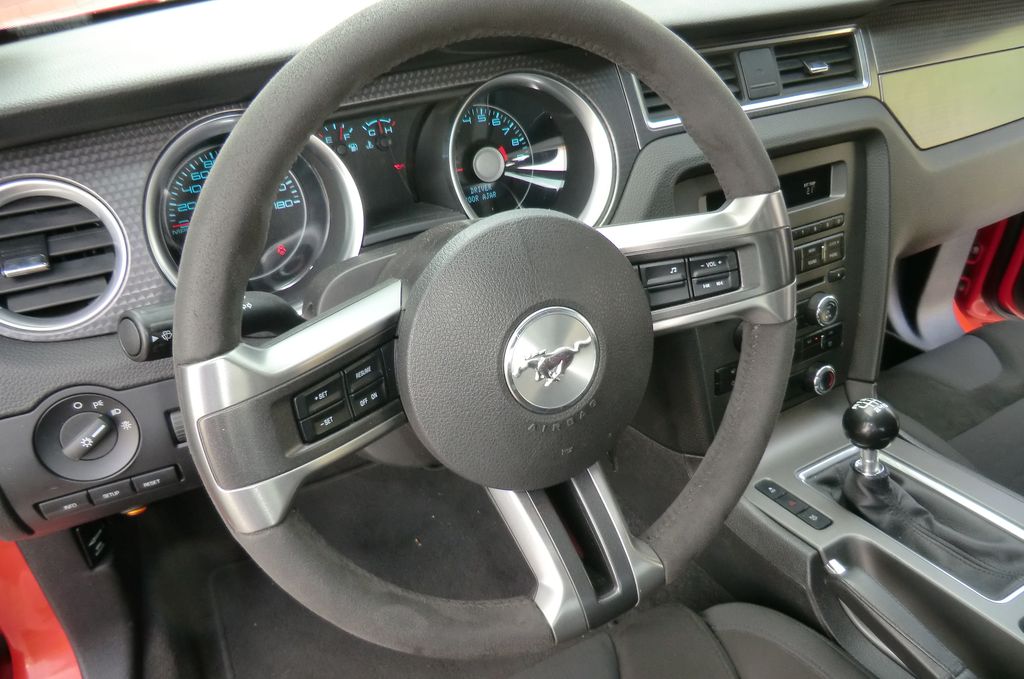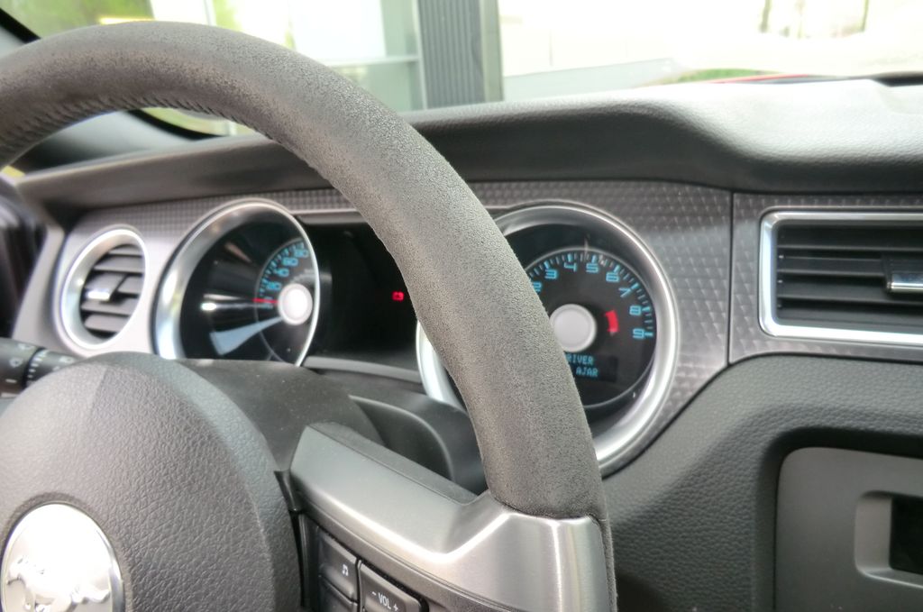 Remek fogású és szép is az alcantarába varrt háromküllős kormánykerék, de a Mustangot azért nem a belseje fogja eladni