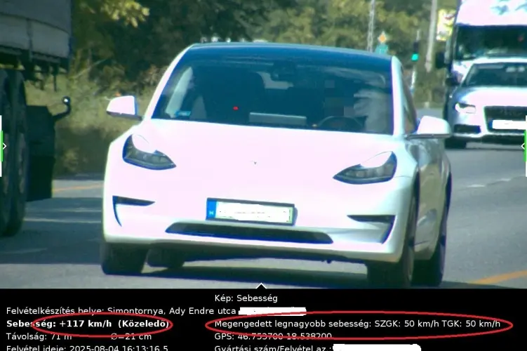 Minden bizonnyal előzés közben készülhetett a drága fotó a Tesláról, ám a villanyautó sebessége aligha csak a manőver miatt lépte át a megengedettet. A rendőrség által közzétett fotó szerint a szóban forgó szakaszon 50 km/óra a legális, viszont a sofőr 117 km/órával húzott el a mérőműszer előtt. A rendőrök nem sokkal az eset után meg is állították, viszont nem tudott magyarázatot adni arra, miért közlekedett lakott területen belül a megengedett több mint kétszeresével. Mindenesetre a helyszínről 8 közlekedési előéleti ponttal gazdagabban távozott, azonban a pénztárcája 312 ezer forinttal rövidebb lett.