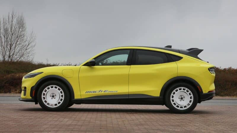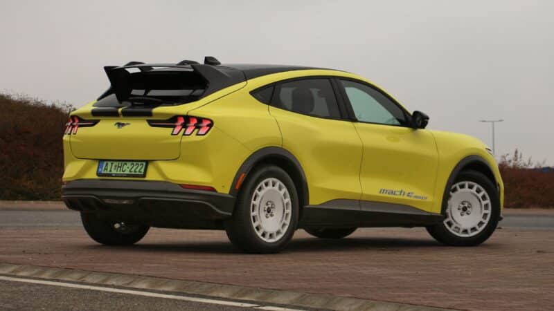 Alapvetően a sima Mach-E is szemrevaló darab a SUV-ok tengerében, viszont a Rally magamutogatásra született. A sárga fényezés már önmagában feltűnő, a kasztnin végigfutó versenycsík csak még tovább fokozza a sportos hatást, amelyet a 19 colos, raligépekre emlékeztető felnik, és a jókora hátsó szárny tesz teljessé. Persze továbbra is láthatók az eredeti Mustangra hajazó részletek, mint például a hátsó lámpatestek.