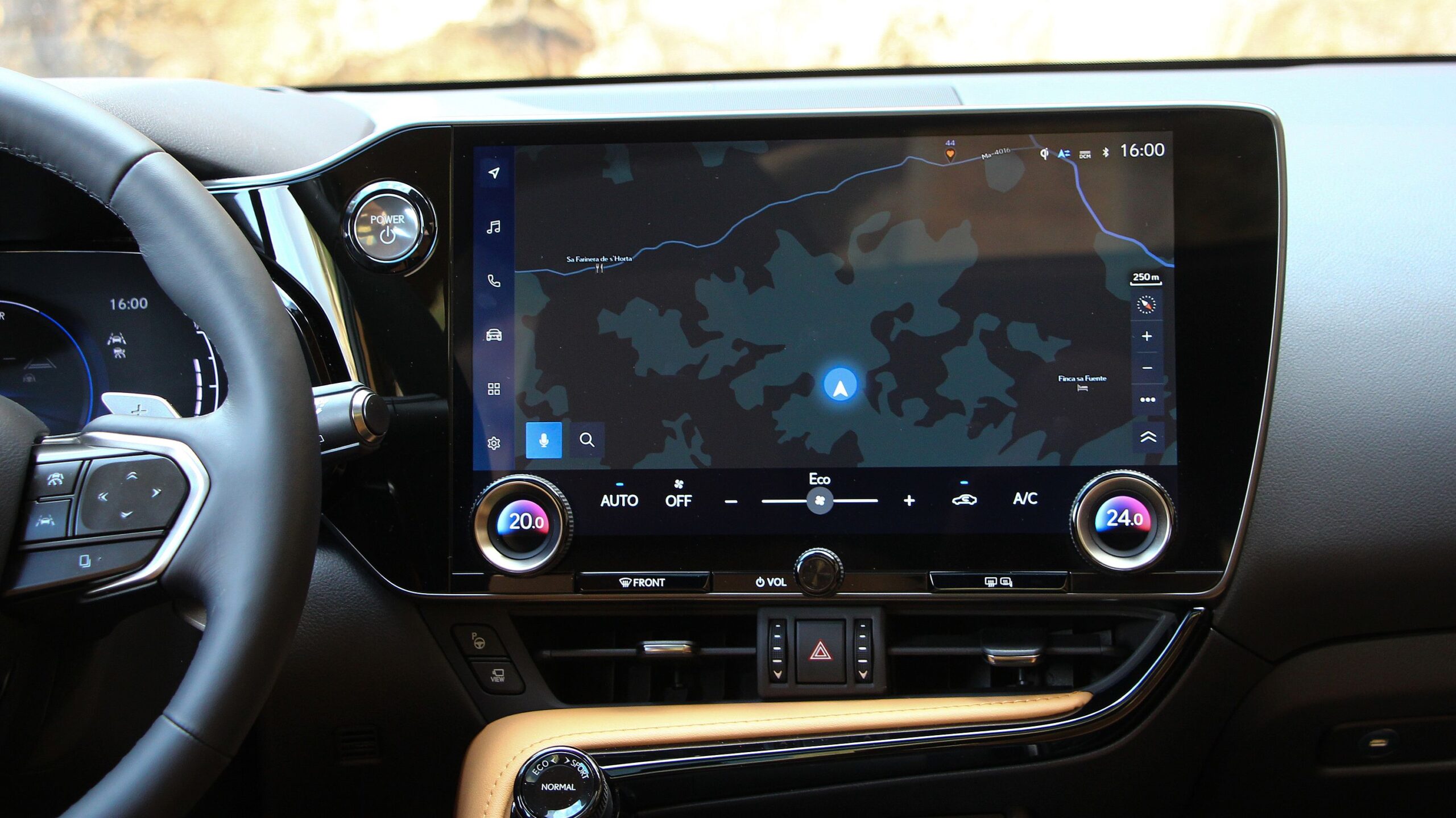 A gyakran használt funkciók továbbra is fizikai gombokat kapnak. A vezetéshez kapcsolódó gombok a kormánykerék környékén találhatók, a hangrendszer és a klíma vezérlői pedig a központi kijelző környékén. A jellemzően álló helyzetben használt gombok is a középkonzolra kerültek. Az üzemmódválasztót is leszedték a kormánykerék mögül. Bár látványos megoldás volt, most sokkal kényelmesebb hozzáférni a tekerőgombhoz a középkonzol érintőképernyője alatt. Apropó érintőképernyő. Talán apróságnak tűnhet, de itt is tetszik, hogy nem csak „beragasztottak” egy téglalap alakú táblagépet. A kijelző jobb oldala ívelt, az ív pedig tovább folytatódik a középkonzolon. Igényes és szemet gyönyörködtető megoldás! Mérete 14 col, az infotainment ráadásul magyarul is érti a hangvezérlést, szia Lexus felszólításra életre kel.