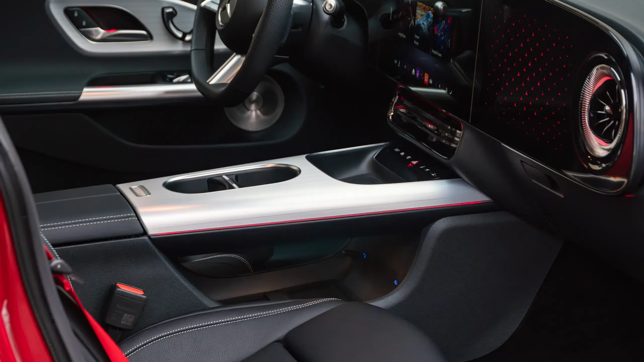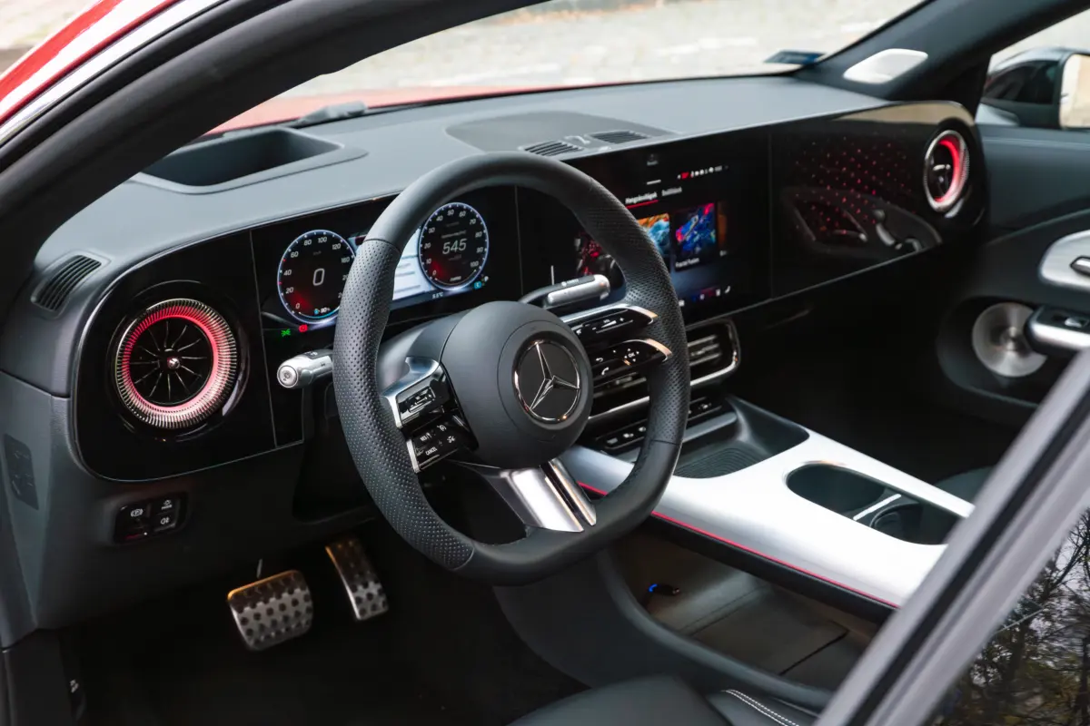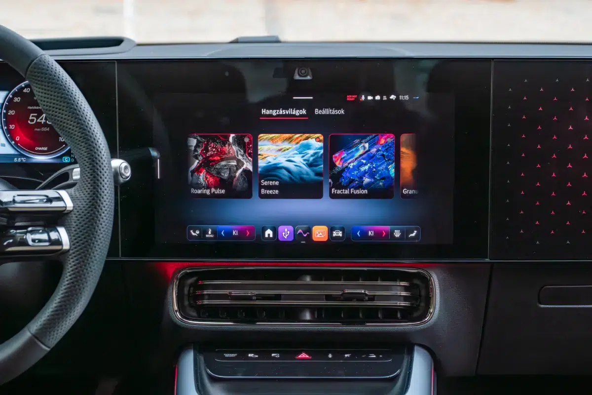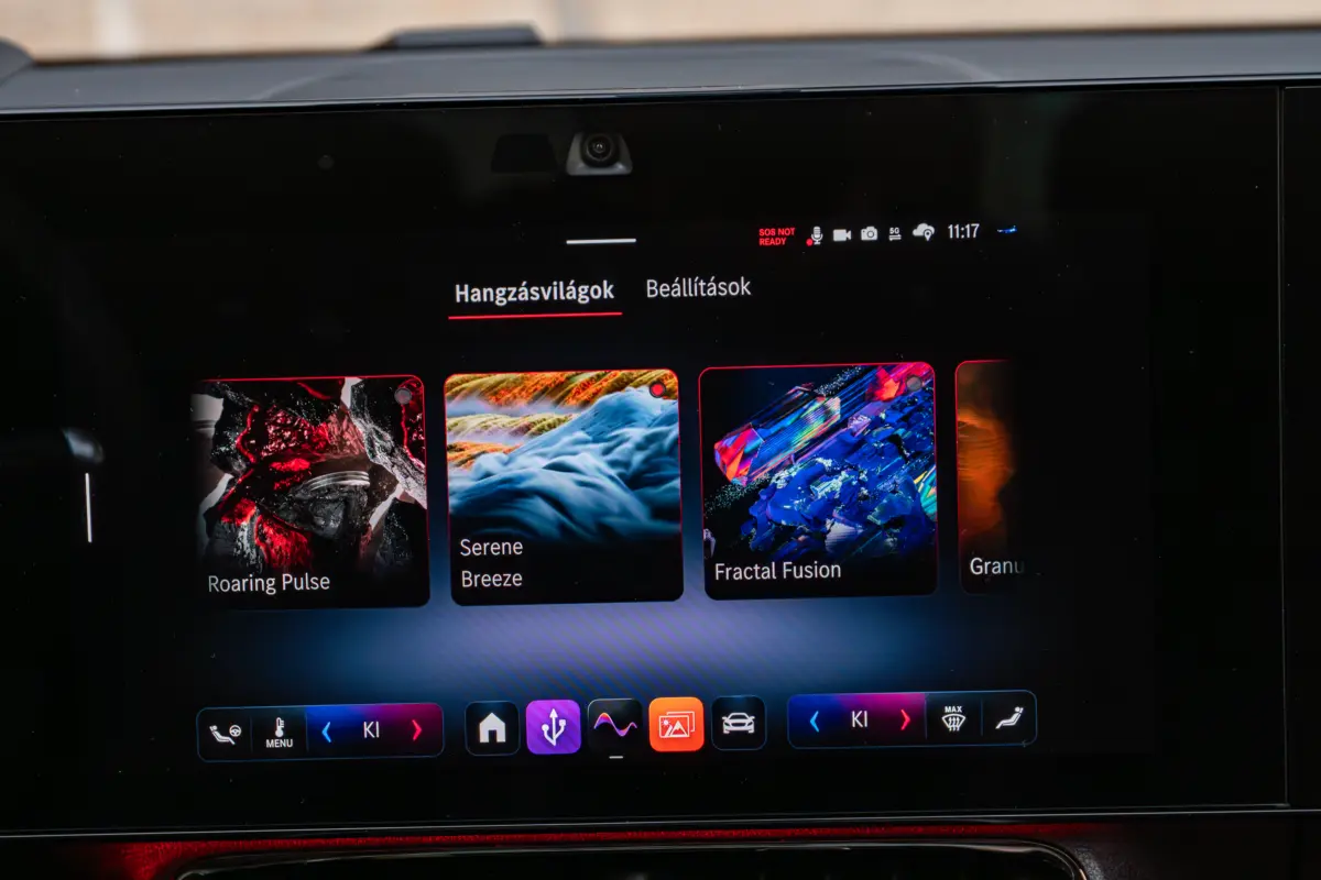 Bent igazi prémium hangulat fogad. Igényes, kellemes tapintású anyagok mindenhol, és ami nagyon fontos, hiba nélkül összerakva. Nincsenek zörgések, nyöszörgések, elengedő ragasztások, varrások. Erre most már nagyon odafigyeltek, minden azt a precizitást tükrözi, amit elvárnak a Mercedes ügyfelei, akkor is, ha "csak" alsó-középkategóriában vásárolnak. A műszerfalat a két nagy képernyő uralja. A vezető előtti 12,25 colos nagyon szép grafikával és éles képpel, az infotainment érintőképernyője pedig 14 colos, a menürendszer csak elsőre kacifántos, néhány óra alatt már minden magától értetődő lesz. Az utas előtt szintén ott egy 14 colos felület, ami a tesztautóban csak hangulatvilágítást kapott, de oda is rendelhető képernyő, amelyen akár streaming videók, vagy játékok is futhatnak a jobbegyben ülő szórakoztatására.