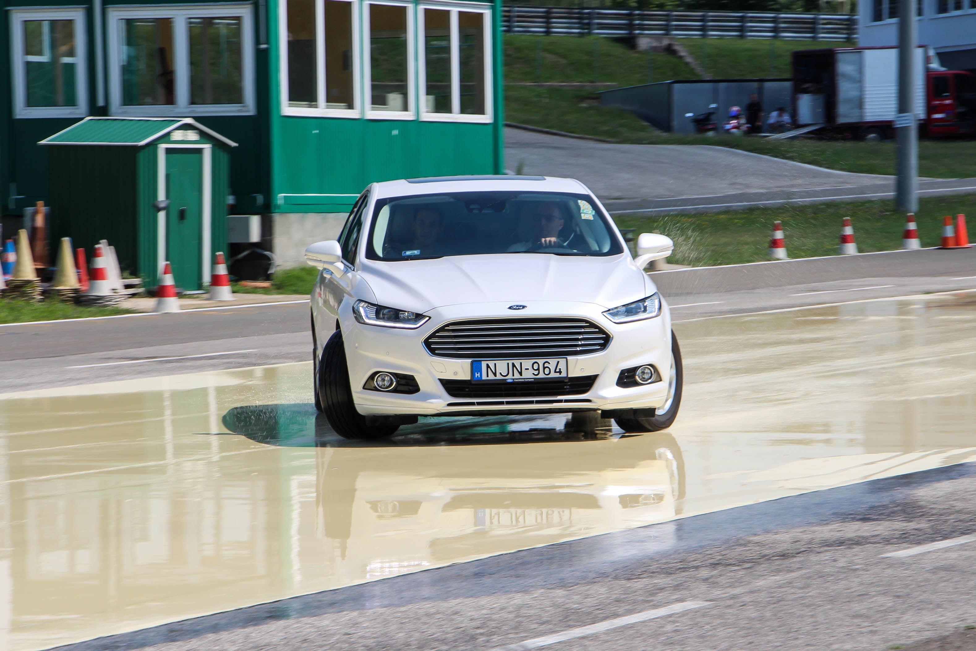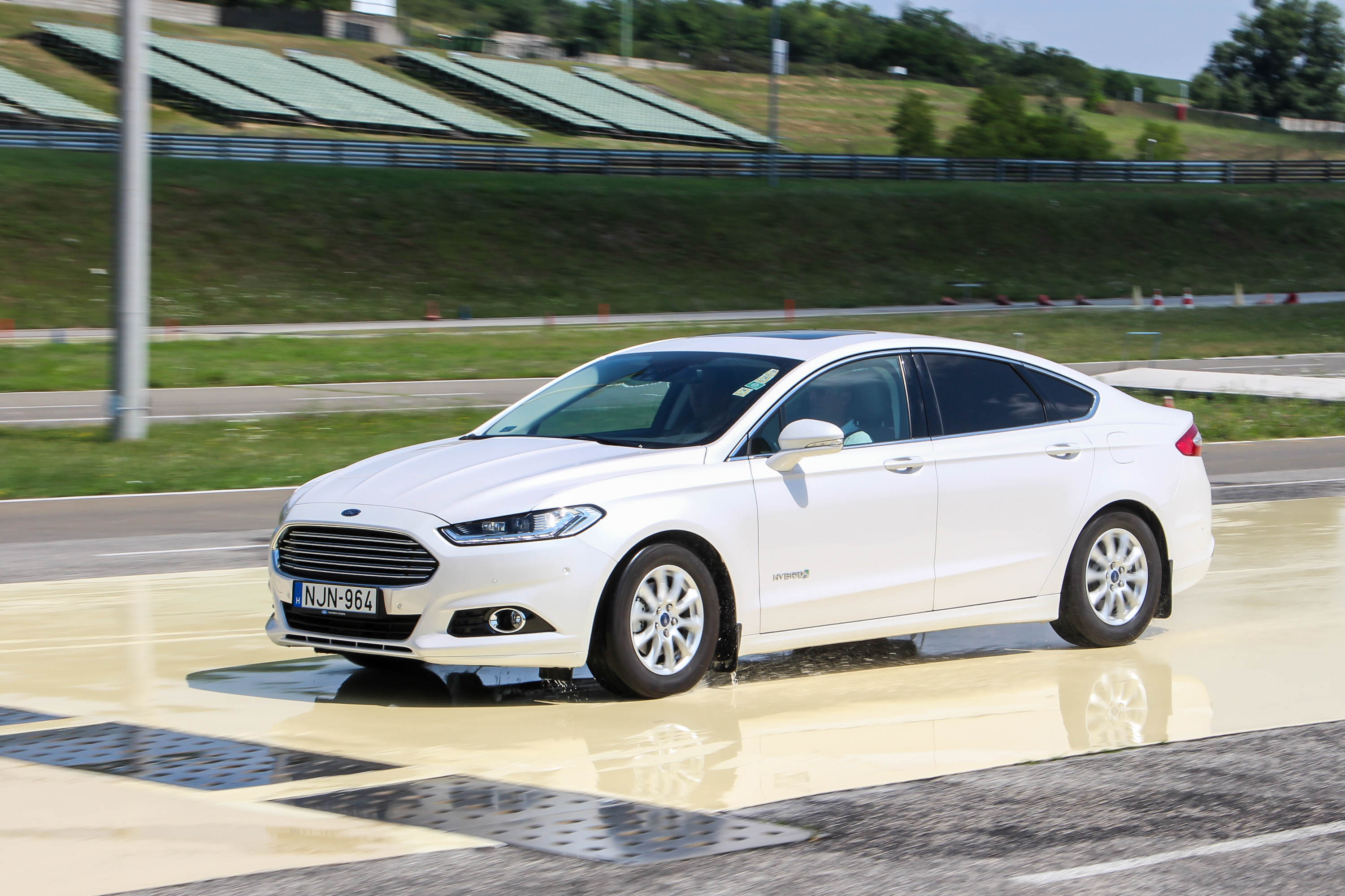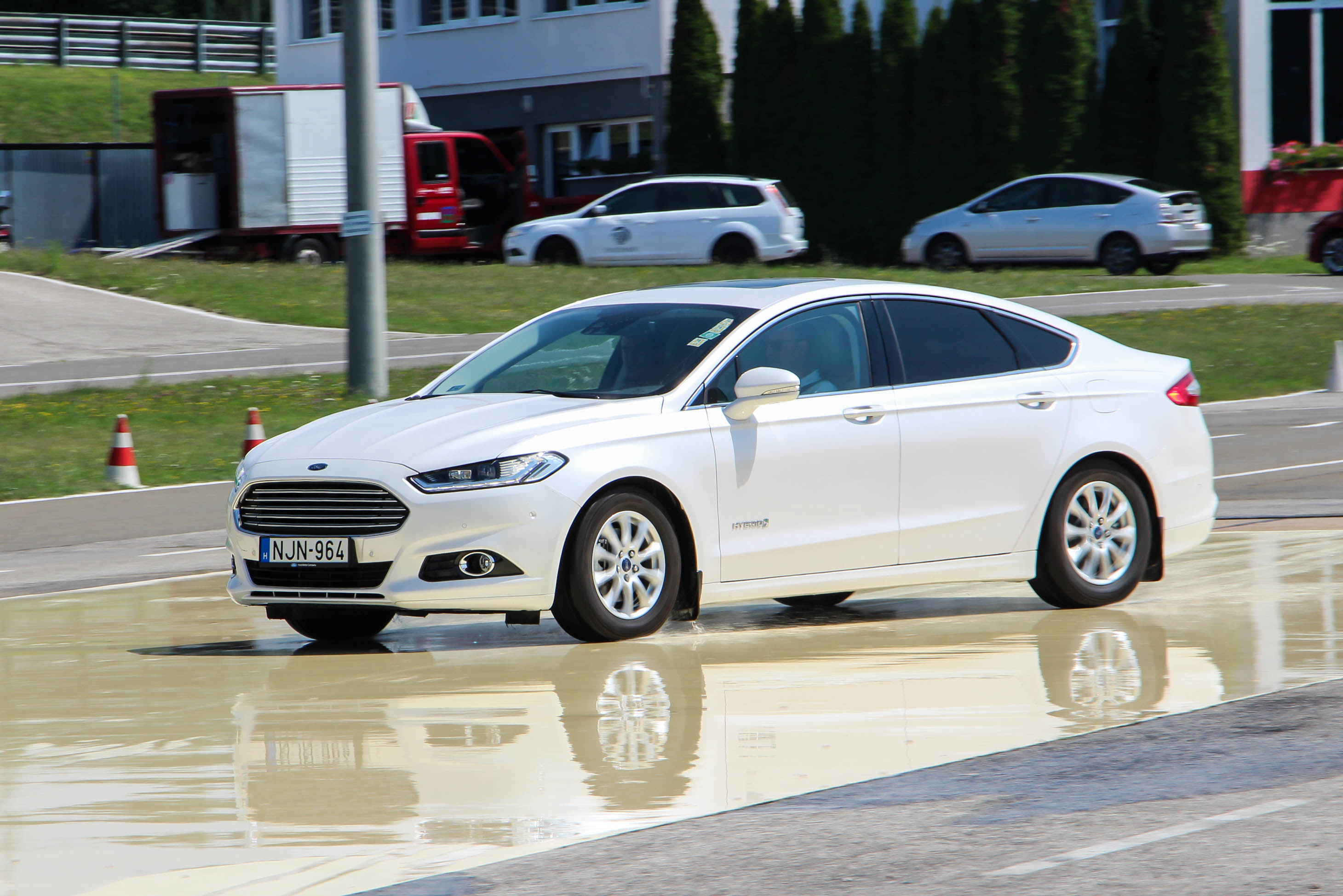 A nagy tömeg nem előnyös menetdinamika és kanyarjellemzők szempontjából, az úthibákat viszont nagyon szépen rugózza ki a hatalmas bálnaként viselkedő Mondeo, pláne az elképesztően ballonos, 215/60 R16 méretű abroncsain. Igaz, a Mondeo multilink futóművével szemben hátul kettős keresztlengőkaros, elöl azzal egyezően MacPherson futóművű Prius is kellemesen rugózik a peresebb, 215/45 R17-es gumijain. Irányíthatóság szempontjából a viszonylag nagy tömegeltérés ellenére nincs komoly különbség. A Prius kormánya valamivel szintetikusabb, ugyanakkor a kisebb, csekélyebb tömegű autó könnyebben vezethető. A Groupama Tanpályán mindkét autót próbára tehettük szélsőségesebb körülmények között is, itt is kijött, hogy könnyebb a Priusszal bánni, ugyanakkor ESP-je olyan keményen (de nagyon ügyesen) avatkozik be, hogy a Mondeo több vezetési élményt hagy a sofőrnek - már amennyire lehet ilyenről beszélni egy 1,7 tonnás limuzinnál.