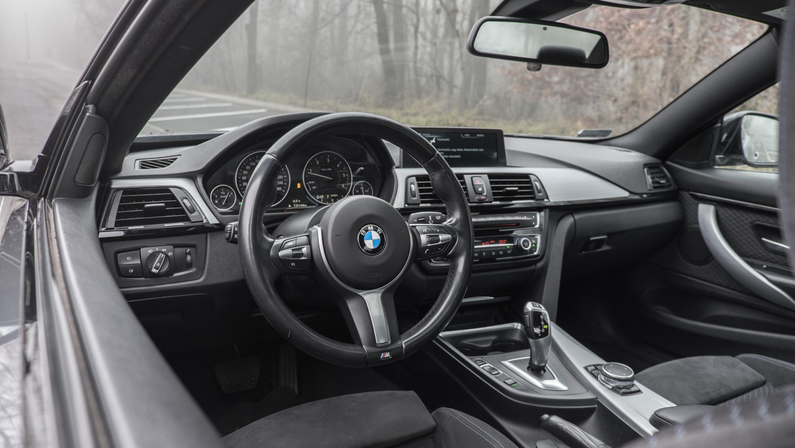 A kék varrású Alcantara huzat annyira jellegzetes és passzol az 1-estől az 5-ösig mindenhez, hogy szinte lehetetlen hasonlóan harmonikus sportcsomagot találni a kategóriában. Kopás nincs, az ülések tiszták, nagyon jól néznek ki, hátul nyilván sokan nem ültek, pedig a 4-es épp az a kupé, amiben van hátul hely a lábaknak is. A BMW-k anyagai általánosan jól bírják az éveket, kivéve a kormány bőrözését. Eredetileg nagyon puha tapintású bőr kerül az M-es kormányra, ami pár évesen ilyen fényes már, mint ebben az autóban is. Lehetetlen megvédeni tőle, mindben ilyen lesz, az eredeti állapotot nem lehet megőrizni sajnos. Az autó belseje a külsőhöz hasonlóan rendezett, nagyon otthonos annak, aki szereti a BMW-k sofőr felé fordított középkonzolját, a pirosas megvilágítású gombokat és ezt a logikus ergonómiát, amit évtizedek óta frissítgetnek és csiszolnak.