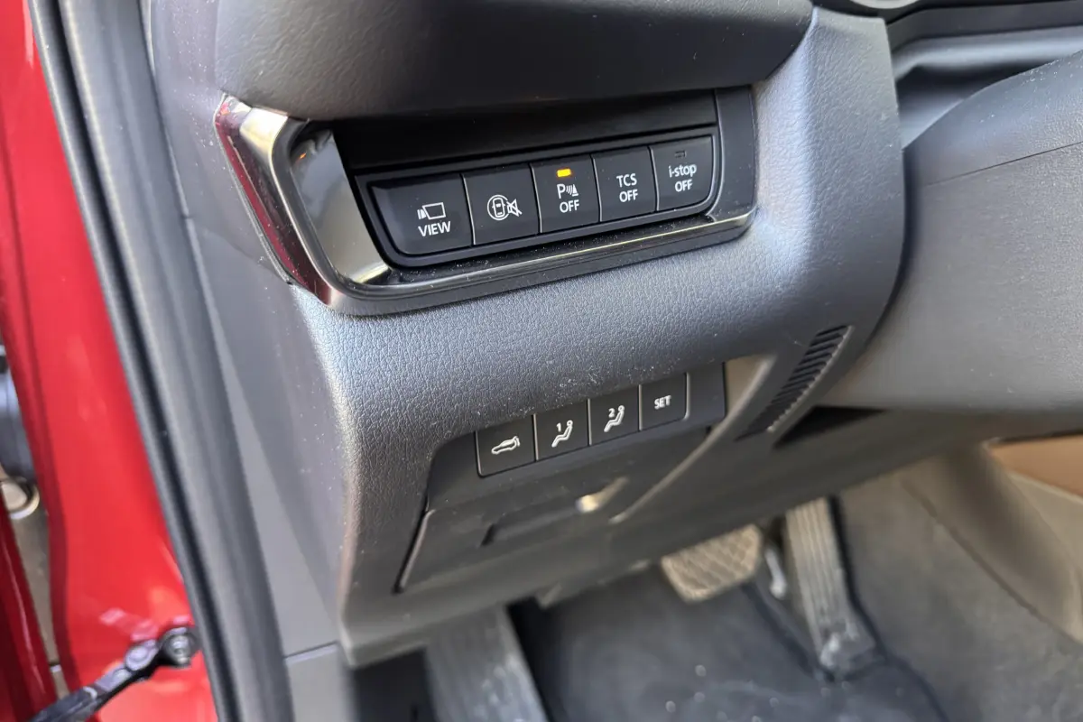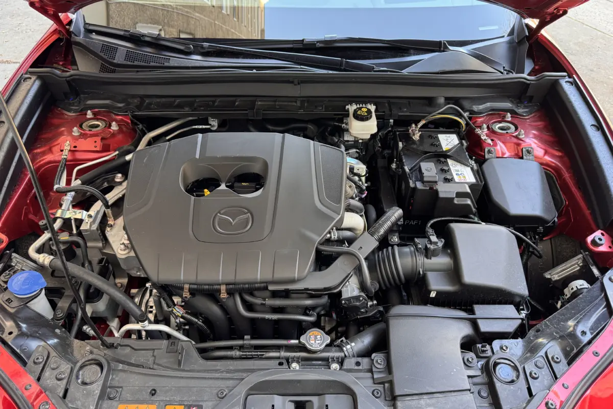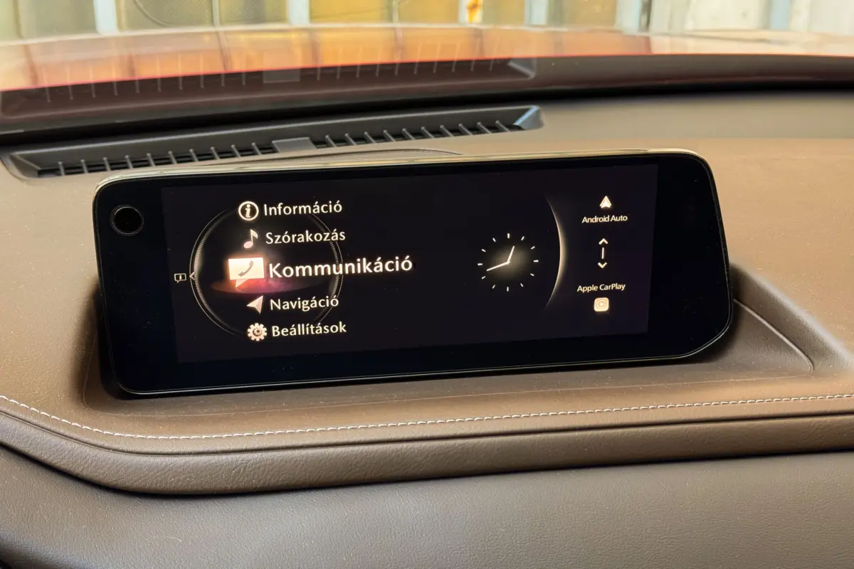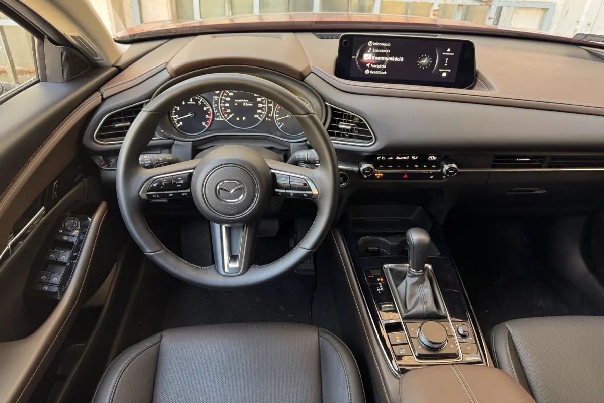 Fekszik is a hajtásláncnak a hosszabb autózás, mert a 2,5 literes, szívó benzinmotor a sima városi rohangálásban iszákossá válhat. A fentebb belengetett változás itt tapasztalható, mármint a motorpalettán. Eltűnt a négyhengeres kétliteres Skyactiv-G a kétféle teljesítményszinttel. Maradt a szintén kétliteres Skyactiv-X, valamint a tesztautóban is dolgozó 2,5 literes. Amelynek járáskultúrája csodás és ebben a lágy hibrid rendszer is segít, mert azért a Mazda is halad a korral. Összesen 140 lóerőt tud, ami tökéletesen elég a normális közlekedéshez, kellőképp rugalmas, a 238 Nm-nyi nyomatk 3300-as fordulatnál érkezik, ami szokatlan lehet a turbós motorokhoz szokott sofőröknek, de számomra felüdülés a szívó négyhengeres egyenletesen felépülő ereje. Az üresen kicsit több, mint 1,4 tonnás autó tesztfogyasztása 8,2 liter lett vegyes használatban, ami egy ekkora motortól elfogadható, és hosszabb, akár autópályás utakon, egyenletes járással még csökkenthető is.