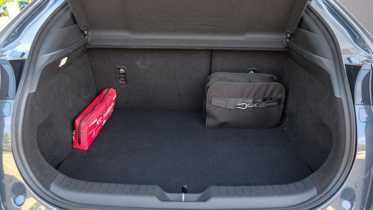 A motort jobb oldalra építették, de az autó egyensúlya így is tökéletes. A nagy ürességre pedig az a magyarázat, hogy érkezik egy hatótávnövelős változat, és a motortér üres terébe egy új Wankel motort építenek, ami majd termelni tudja az áramot. Egyelőre viszont csak az alapverziót próbálhattuk, a hatótávnövelősről még csak hírek vannak. Az MX-30 villanymotorja 143 lóerős és 265 Nm nyomatékú, és mint olyan, semmiféle hangja nincs. A Mazdánál úgy gondolták, hogy azért kéne, hogy szóljon valami, így van egy benzinmotorhoz nem hasonlítható berregés gyorsításkor, ami egyenletes haladásnál elhallgat. Még nem döntöttem el, hogy ez zavaró-e, majd meglátjuk az első tesztautó próbájakor hosszú távon. A motor kellőképpen jól húz, telepakoltuk utasokkal, és még úgy is nagyon fürgén mozgott, érzésre a 9,7-es 0-100-as gyorsulás is megvolt, ami persze nem egetverő, és nincs is semmi létjogosultsága a kategóriában. Tökéletesen elfogadható a dinamikája, meglódul magasabb tempóról is, nincs kerékpörgetés induláskor, elosztották az erejét, szimplán jól használható, és ennyi bőségesen elég is neki.