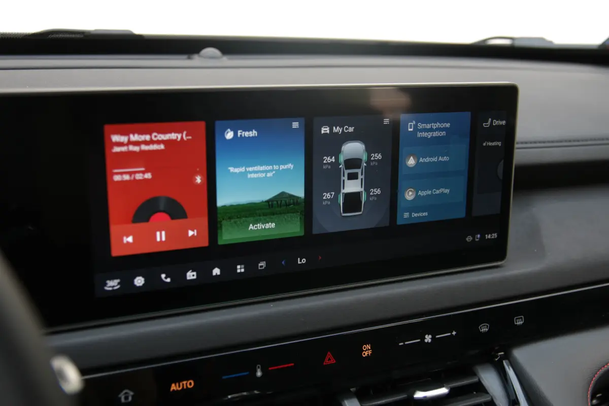 Az utastérben is igaz mindez: a duplakabin kellően tágas, modern hatást kelt a két képernyőből álló műszeregység-infotainment kombóval, ráadásul semmi sem csak dísznek került bele. Ha valamiben ránézésre meg lehet kapaszkodni, az tényleg elbír, illetve az anyagminőség is jól egyensúlyozik a prémiumérzet és a funkcionalitás között. Használat közben azonban egyértelművé válik, hogy itt a régimódi luxus került előtérbe, nem pedig a kütyük. Hiába a nagy képernyő, a szoftveres oldala a dolognak kizárólag az alapokat tudja, a rádió hangzása kritikán aluli, illetve a kezelőfelület is nagyjából olyan, mintha egy alapáras Android alapú okos TV, vagy több éves kínai tablet került volna a műszerfal tetejére. Hogyha ezek a részletek zavarnak, akkor ez nem a te játékszered, ám a Maxus nem is erről szól. Akad viszont 360 fokos kamerarendszer, vezeték nélküli telefontöltő, illetve hátsó szellőző is, valamint a kormány és az első két ülés is fűthető.
